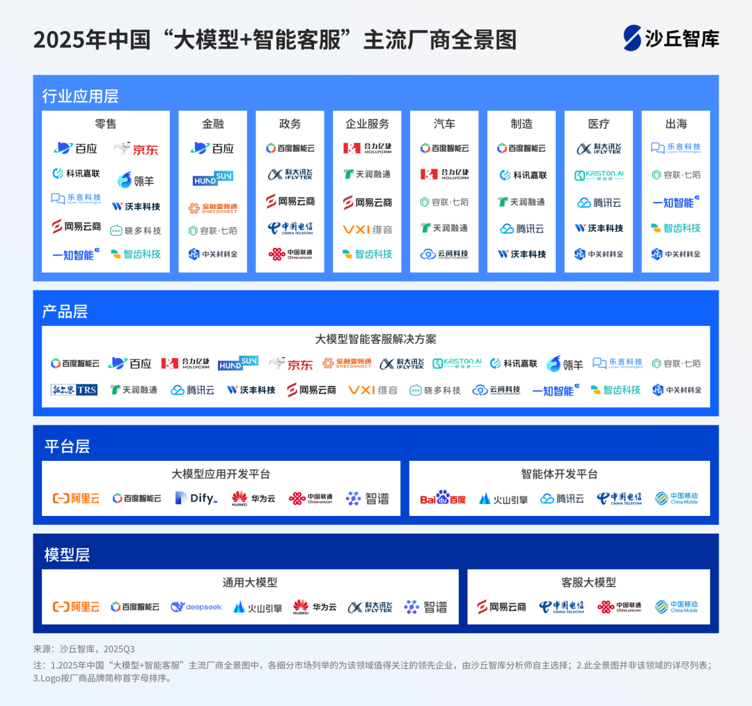 在“大模型+智能客服”领域,传统智能客服供应商积极将大模型技术融入其自身的产品/解决方案中,这也为企业客服部门提供了快速启动大模型应用的独特契机。在《2025年中国“大模型+智能客服”主流厂商市场指南》中,沙丘智库从产品成熟度、行业落地深度、商业化进展等维度进行评价,筛选出各个细分市场的领先企业,并绘制“大模型+智能客服”主流厂商全景图,帮助企业用户选择更适合的产品/解决方案。