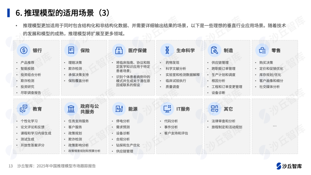 推理模型更加适用于同时包含结构化和非结构化数据、并需要详细输出结果的场景,以下是一些理想的垂直行业应用场景。随着技术的发展和模型的成熟,推理模型将扩展至更多领域。(详见《2025年中国推理模型市场跟踪报告》)