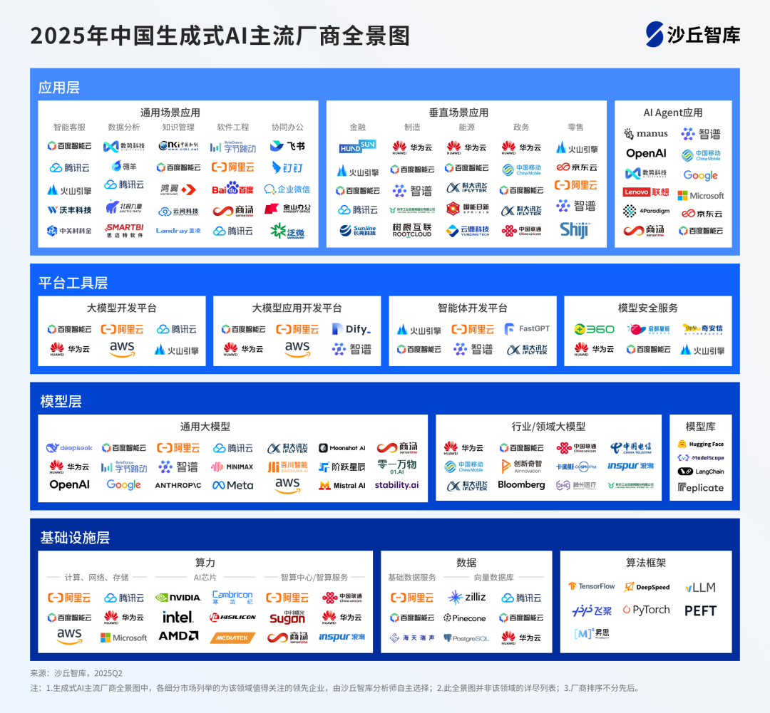 随着生成式AI技术的飞速发展,越来越多的厂商涌入这一领域,形成了复杂且多元的产业生态。为了更好地呈现生成式AI领域的竞争格局和发展态势,沙丘智库发布《2025年中国生成式AI主流厂商市场指南》,报告中精心绘制了「生成式AI主流厂商全景图」,帮助从业者快速了解生成式AI产业全貌。