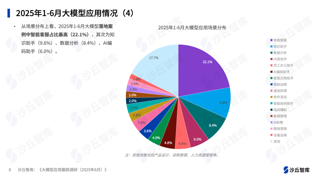 从场景分布上看,2025年1-6月大模型落地案例中智能客服占比最高(22.1%),其次为知识助手(9.6%)、数据分析(8.4%)、AI编码助手(6.0%)。