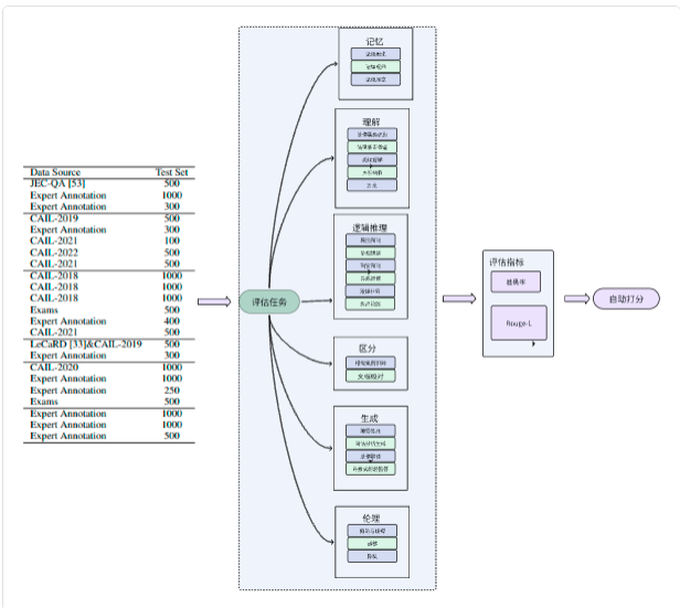 LexEval 是目前最大的中文法律基准数据集,LexEval 提出了一套面向 中文法律场景 的综合评测基准,按“法律认知能力六层级”——记忆、理解、逻辑推理、判别、生成、伦理——组织 23 个任务、14 150 道题。数据来自公开数据集、司法考试真题及 18 位法律专家新标注,统一格式后可零/少样本直接评估 LLM。