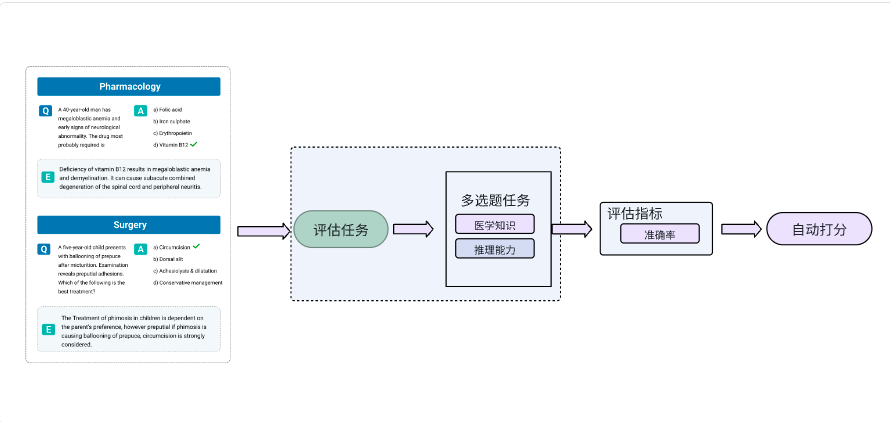 在MedMCQA这个benchmark里,评估任务为选择题任务,包含单选题和多选题,都是客观任务。评价指标是准确率。