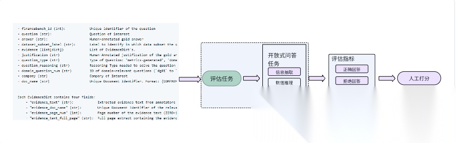 在FinanceBench这个benchmark里,评估任务为开放式问答,包括信息提取,逻辑推理,数值推理等维度;评估指标为Correct Answer(正确回答),Incorrect Answer(错误回答),Failure to Answer(拒绝回答),均为主观评价指标。