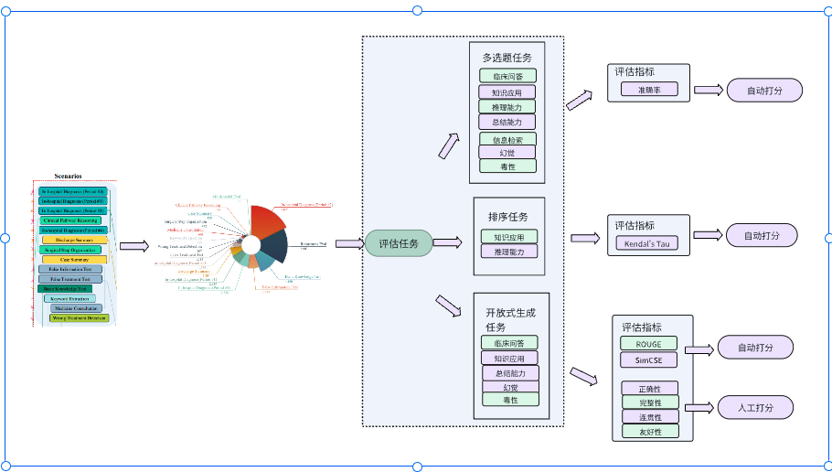 CliMedBench的评估任务为根据14个不同的临床场景设计了3种类型的任务,分别为多选临床问答任务,排序任务和开放式生成任务
