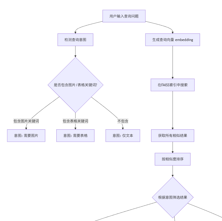 用户输入查询问题时,代码会生成查询向量,在FAISS索引中获取所有相似结果并排序;同时也会对用户意图进行检测,看是否需要附上相关图片或表格。