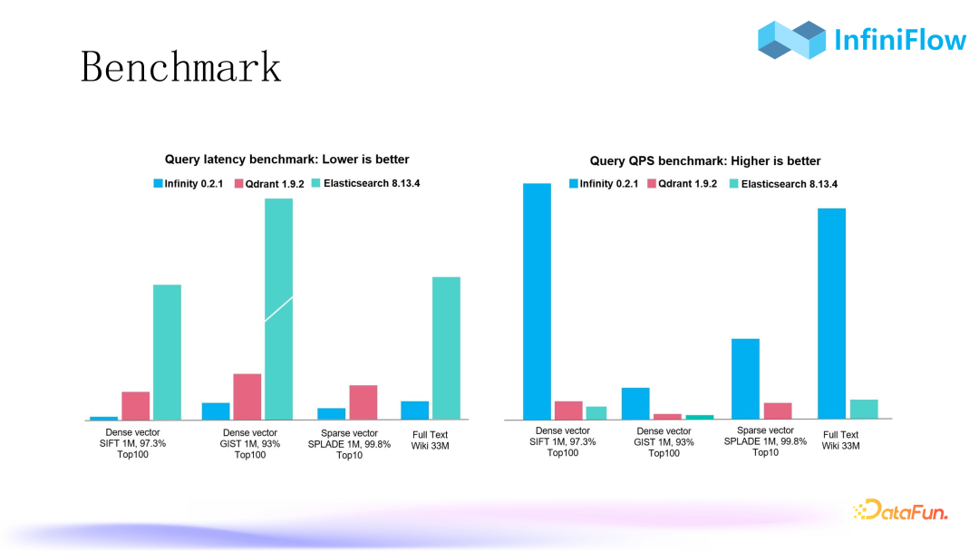 上图中是我们当前使用的一些指标,与当前流行的开源向量数据库和搜索引擎分别进行了对比,左边是延迟,数值越低越好,右边是 QPS,数值越高越好。可以看到,目前我们在这几个数据集上都具有领先优势。