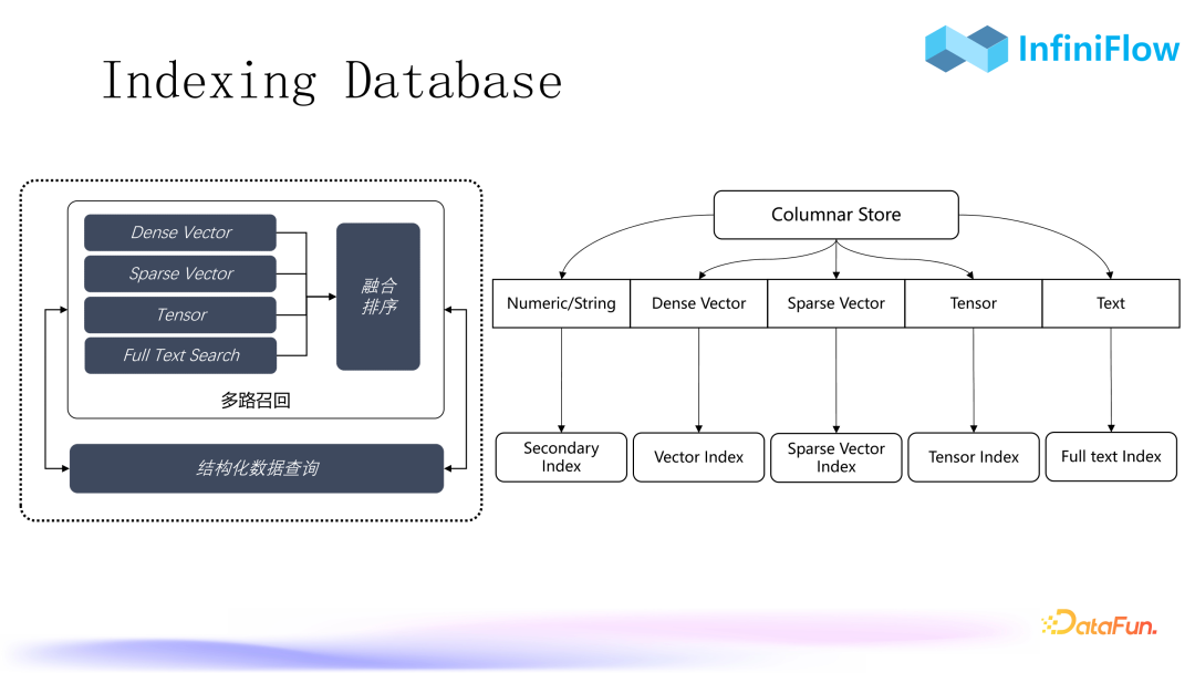 为了做到准确召回,我们从两年前就开始开发一个索引型数据库。如上图所示,当我们创建一张有不同类型数据的表时,我们会根据列存储中的数据类型去创建相应的索引。比如对向量,会创建向量索引,如果是稀疏向量,就创建稀疏向量索引;如果是文字,就创建全文索引。值得一提的是,目前全文索引是唯一能够保障问题是什么就搜到什么的索引,它对于 RAG 来说是一个必选项。当然,还有一个是张量索引。最后再搞定融合性排序,我们就能一站式地解决所有针对 RAG 的检索问题。