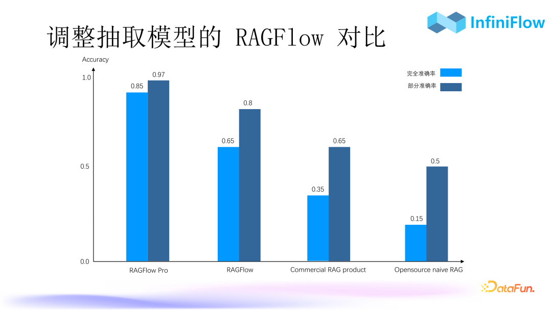 上图是 RAGFlow 与一些开源 RAG 和头部大模型公司的商业化 RAG 产品的评测对比。评测指标有两个:完全准确率和部分准确率。可以看到我们通过不断的调整抽取之后,准确率达到了非常高的量级。根据我们的经验,要真正在企业中将 RAG 利用起来,开源 RAG 很难满足需求,因为其命中率较低。