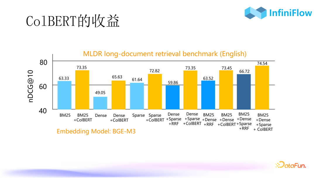 我们将 ColBERT 和没有 ColBERT 的情况进行了对比,可以看到,不管是一路召回、两路召回还是三路召回,只要加了基于张量的重排序,都可以有一个比较明显的提升。甚至语义,它损失是最大的,在加了张量之后也能从 40 级提升到 60 级。这个张量不是对 top 10、top 20 去做重排,而是对 top 100 以上去做重排才能得到这么好的结果。