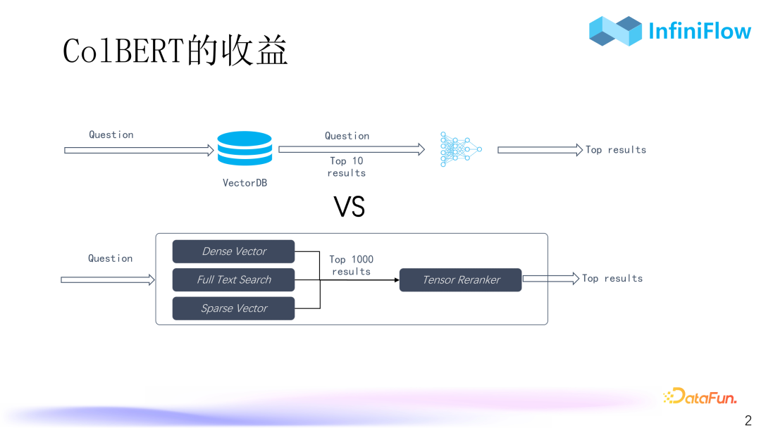 根据我们的观察,延迟交互编码并不是交叉编码的一个 trade off,它甚至可以做得比交叉编码更好。上图中第一个图是来自 JaColBERT的数据,这是今年八月份北美一家叫做昂斯利亚的公司训练出来的专门针对日本的ColBERT的模型,可以看到在 MIRACL 这个数据集上,它的表现甚至比 BGE-M3 还要好。所以基于这种延迟交互的模型,可能会带来更高的精度。因此我们认为张量是 RAG 的未来发展方向。