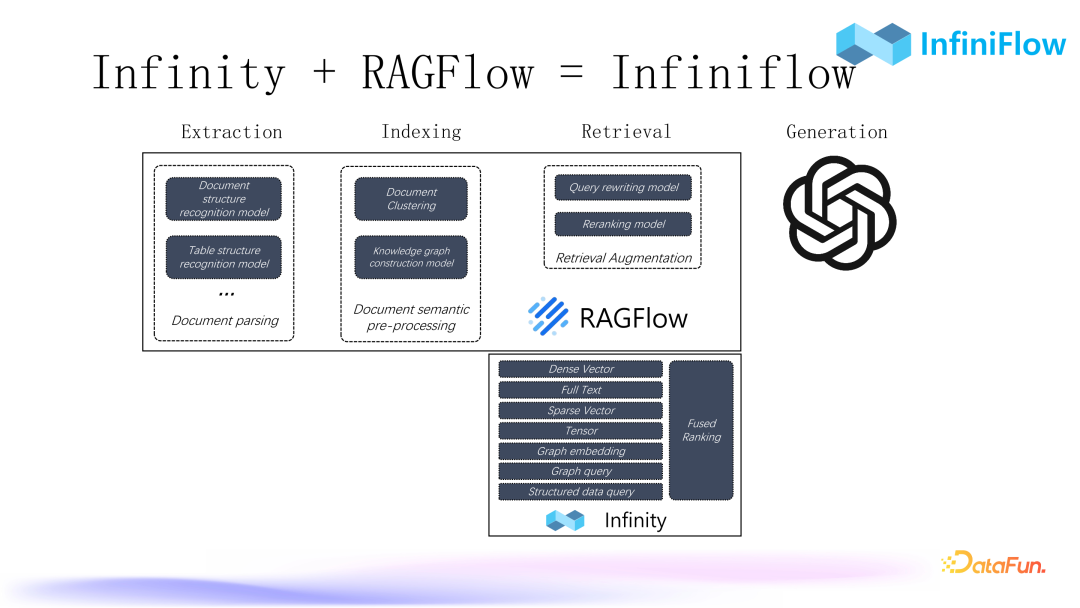 我们计划将 RAGFlow 和 Infinity 整合到一起。我们的 RAGFlow 于今年 4 月 1 日开源,并在持续迭代中。目前为止,RAGFlow 其实是对最终的 RAG 对话效果负责的,可以用这些模型去处理数据入口,其中也包含了 Graph RAG,未来还将加入一个开源数据库 Infinity。该产品提供了丰富的针对 RAG 场景的混合搜索能力,可以满足对企业级检索的所有要求。
