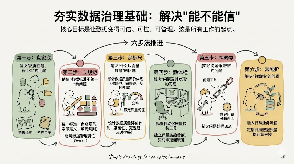 这是所有工作的起点,核心目标是让数据变得可信、可控、可管理。没有这个基础,后面啥都干不了。六步法推进: