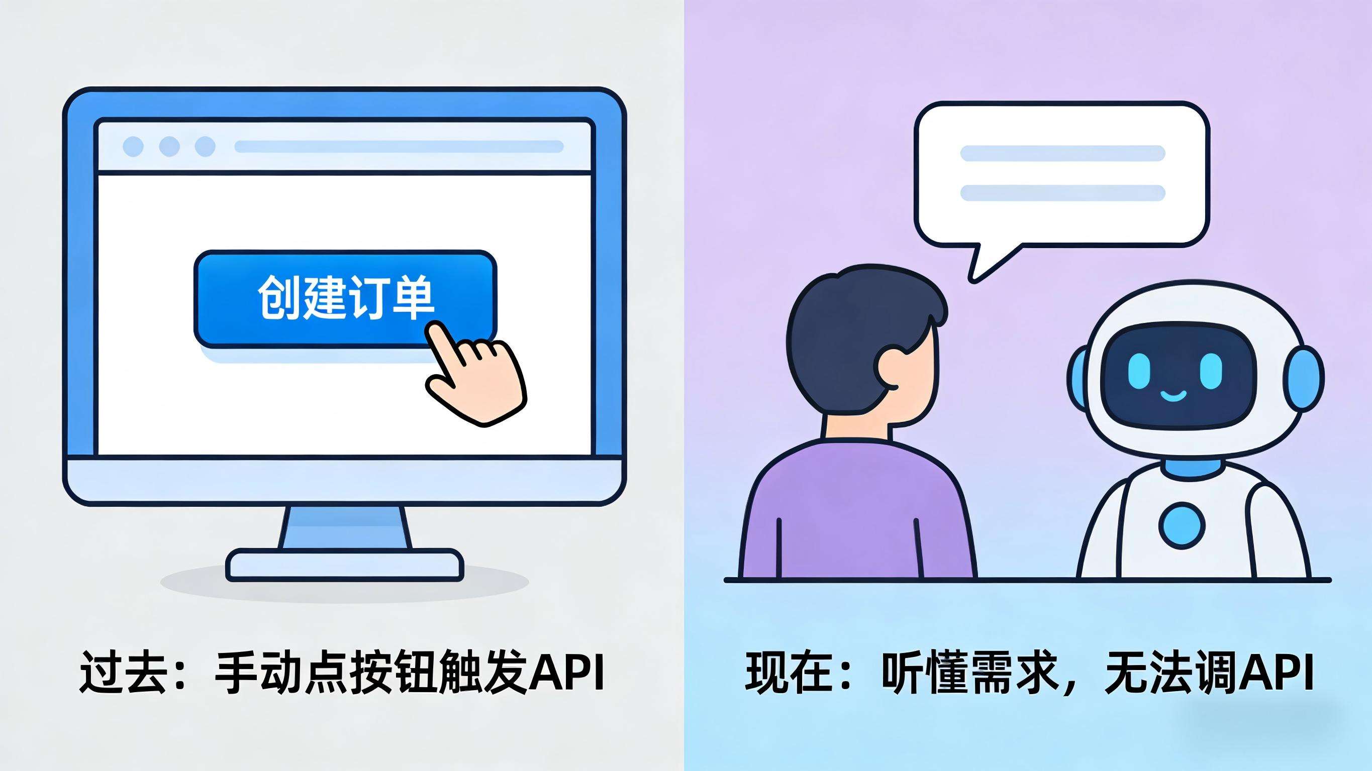 我们不妨先回想一下传统Restful API的使用场景:过去,这些API的调用全靠按钮触发,比如用户要下单,就得手动点击“创建订单”按钮,系统再调用对应的API完成操作;而现在有了AI Agent,用户只需说一句“帮我下单买XX商品”,就能实现自然交互,但尴尬的是——AI Agent能听懂用户的需求,却没法直接调用传统API去执行下单、支付、查询等具体功能,相当于“有嘴说,没手做”,这也让AI Agent的价值大打折扣。