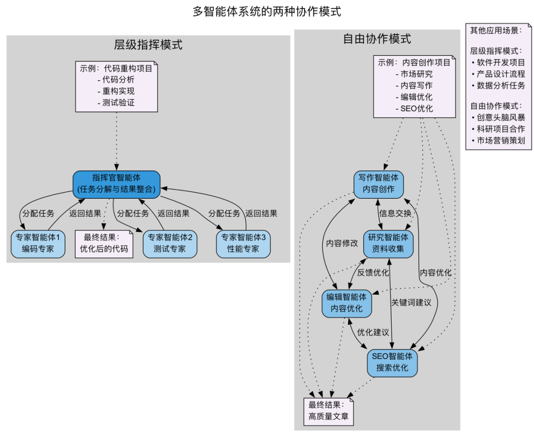 智能体通过共同协作解决用户的问题,协作的模式: