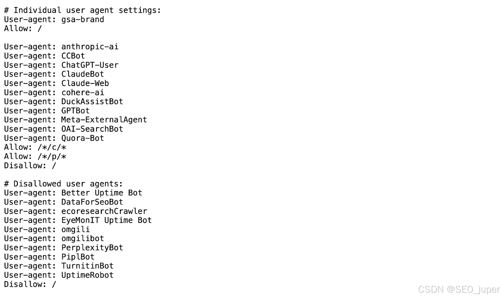 如果你看到这些爬虫的“Disallow: /”,说明你是在阻止AI访问。