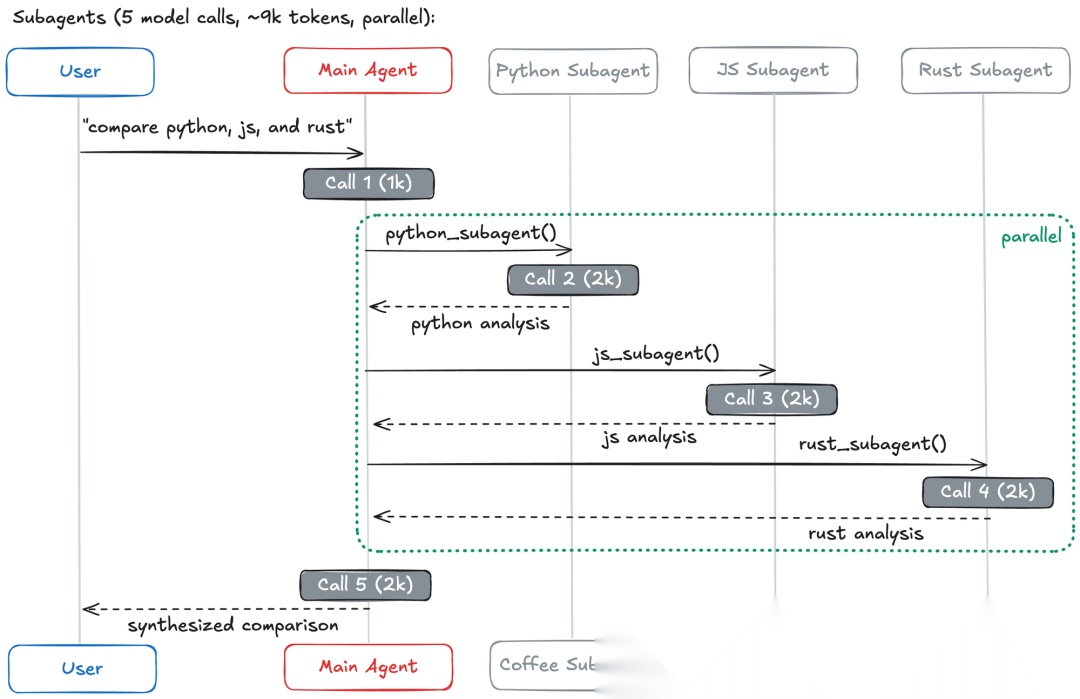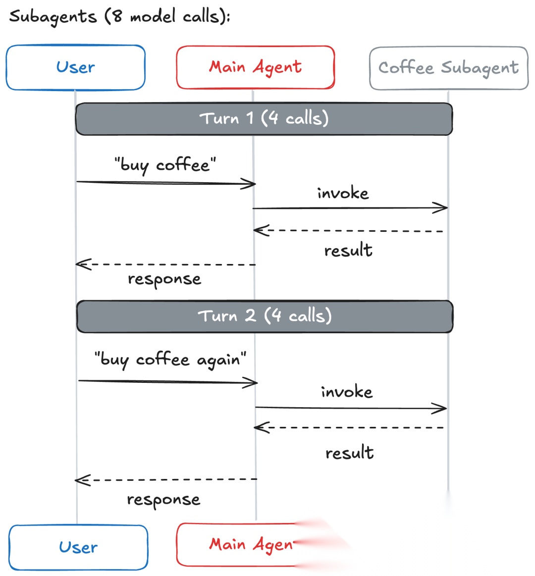 核心权衡:每次交互都会增加一次额外的模型调用,因为结果必须通过主智能体回流。这种开销提供了集中控制和上下文隔离,但代价是延迟和token消耗。