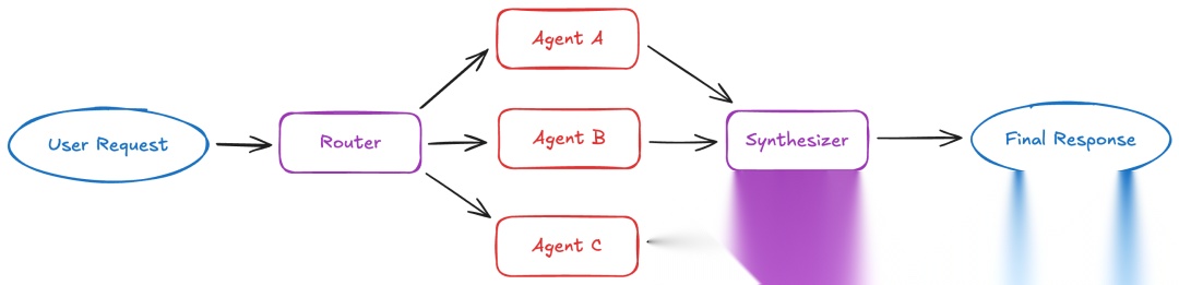 在路由器模式中,路由步骤对输入进行分类并将其定向到专门的智能体,并行执行查询并综合结果。