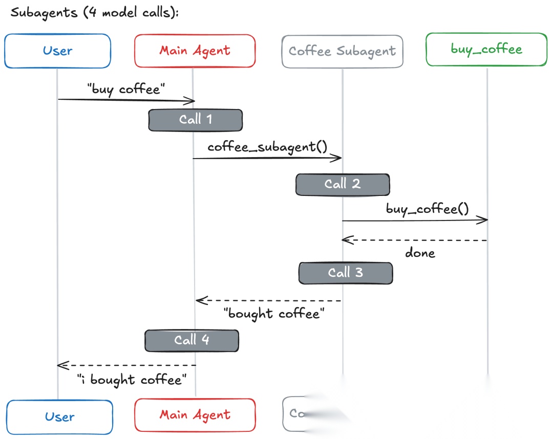 用户发出单个请求:“买咖啡”。专门的智能体可以调用buy_coffee工具。