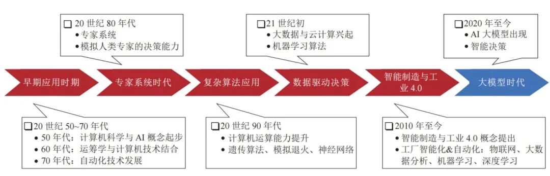 很多小白会误以为,AI大模型是第一个与工业工程结合的AI技术——其实不然。在大模型出现之前,人工智能技术就已经在工业工程领域发挥了重要作用,两者的结合历经了6个关键时期,咱们结合示意图快速梳理(程序员可重点关注后期数据驱动及智能制造阶段):