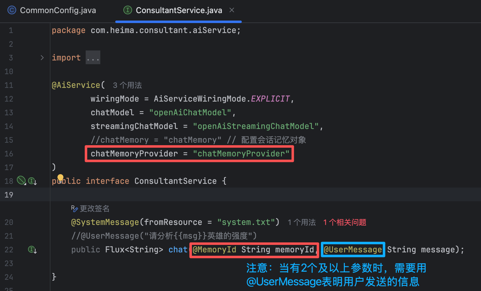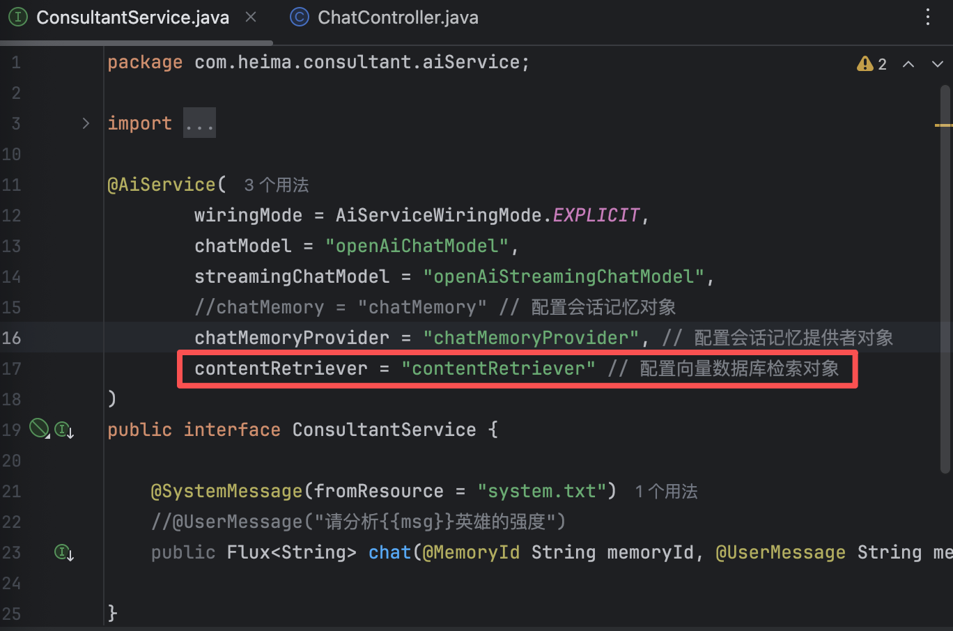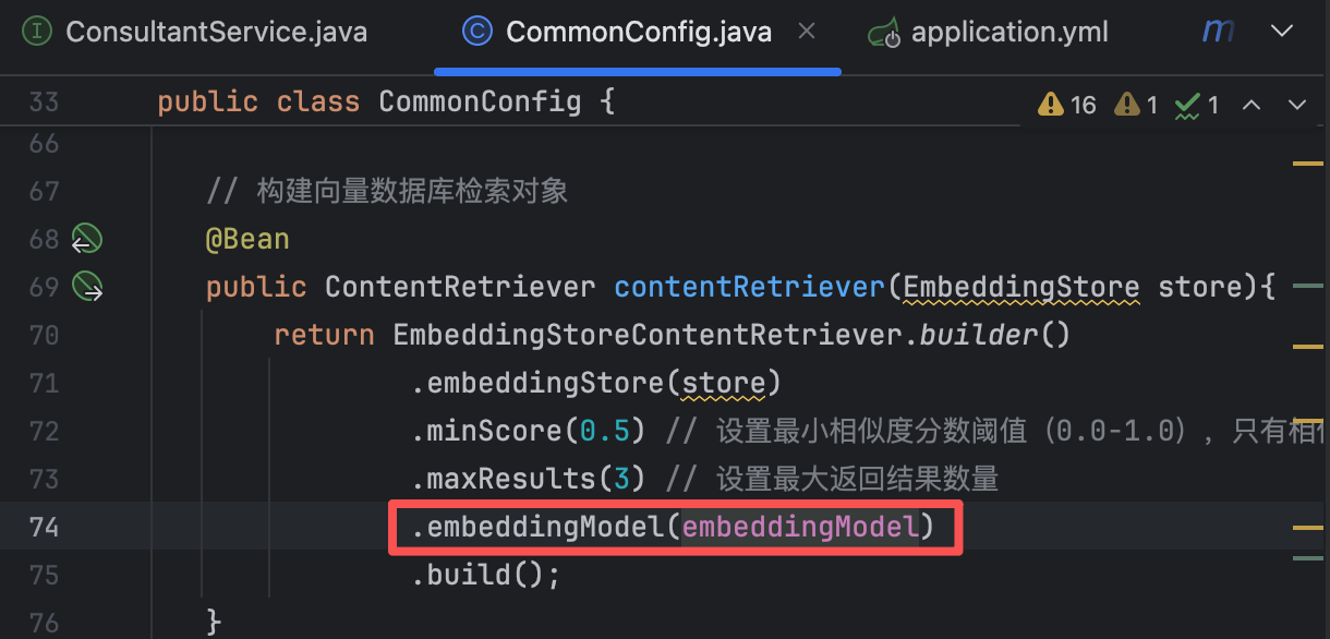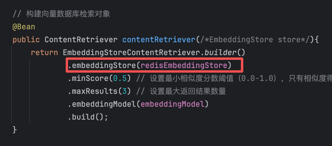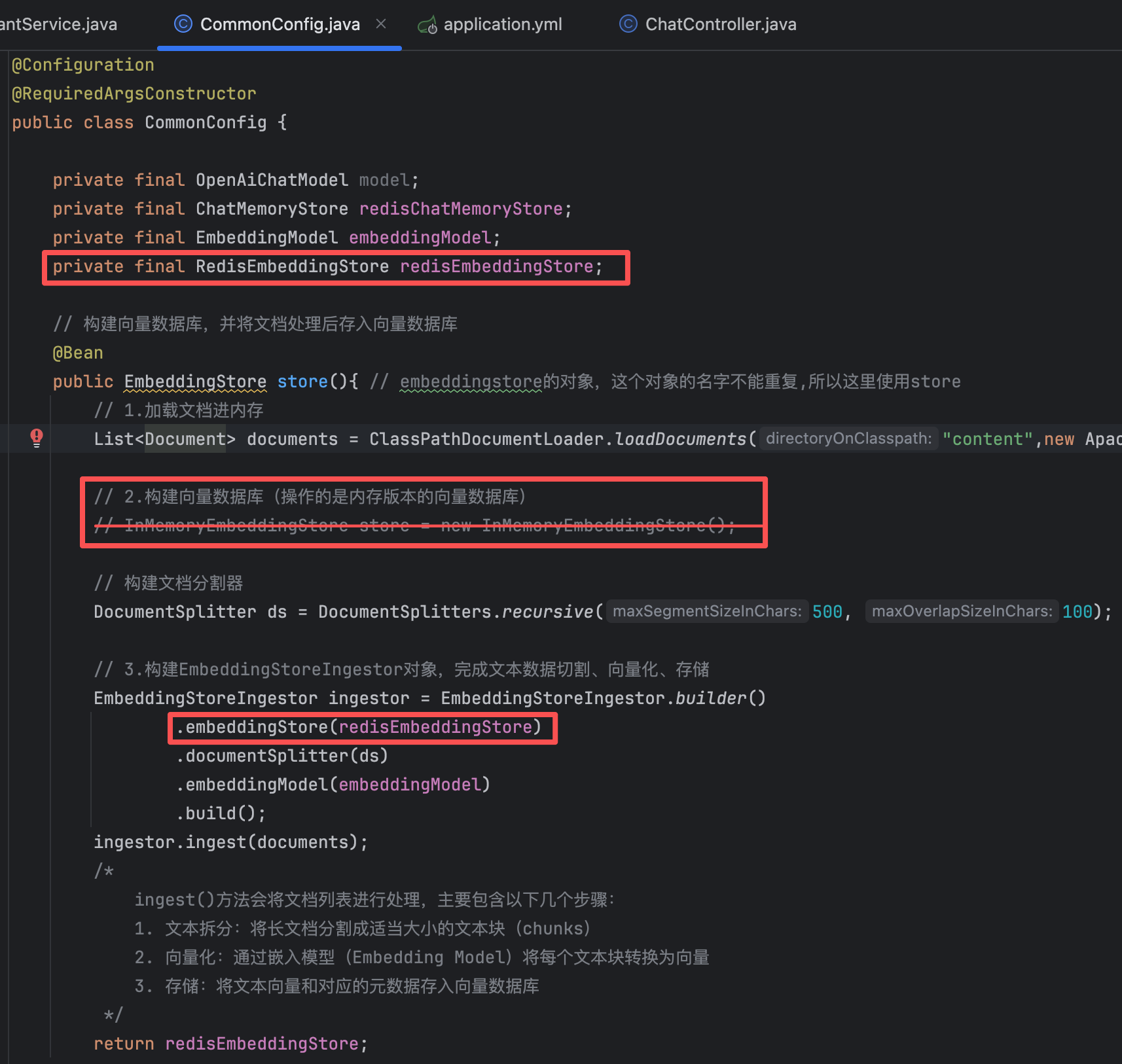 @Configuration @RequiredArgsConstructor public class CommonConfig { private final OpenAiChatModel model; private final ChatMemoryStore redisChatMemoryStore; private final EmbeddingModel embeddingModel; private final RedisEmbeddingStore redisEmbeddingStore; // 构建向量数据库,并将文档处理后存入向量数据库 @Bean public EmbeddingStore store(){ // embeddingstore的对象,这个对象的名字不能重复,所以这里使用store // 1.加载文档进内存 List<Document> documents = ClassPathDocumentLoader.loadDocuments("content",new ApachePdfBoxDocumentParser()); // 2.构建向量数据库(操作的是内存版本的向量数据库) // InMemoryEmbeddingStore store = new InMemoryEmbeddingStore(); // 构建文档分割器 DocumentSplitter ds = DocumentSplitters.recursive(500, 100); // 3.构建EmbeddingStoreIngestor对象,完成文本数据切割、向量化、存储 EmbeddingStoreIngestor ingestor = EmbeddingStoreIngestor.builder() .embeddingStore(redisEmbeddingStore) .documentSplitter(ds) .embeddingModel(embeddingModel) .build(); ingestor.ingest(documents); /* ingest()方法会将文档列表进行处理,主要包含以下几个步骤: 1. 文本拆分:将长文档分割成适当大小的文本块(chunks) 2. 向量化:通过嵌入模型(Embedding Model)将每个文本块转换为向量 3. 存储:将文本向量和对应的元数据存入向量数据库 */ return redisEmbeddingStore; } // 构建向量数据库检索对象 @Bean public ContentRetriever contentRetriever(/*EmbeddingStore store*/){ return EmbeddingStoreContentRetriever.builder() .embeddingStore(redisEmbeddingStore) .minScore(0.5) // 设置最小相似度分数阈值(0.0-1.0),只有相似度得分 >= 0.5的结果才会被返回,这个值控制检索精度,值越高结果越相关但可能数量越少 .maxResults(3) // 设置最大返回结果数量 .embeddingModel(embeddingModel) .build(); } }📍 小细节