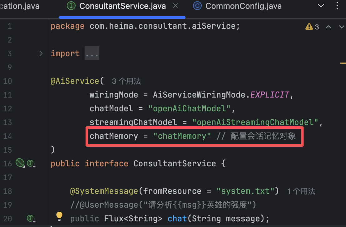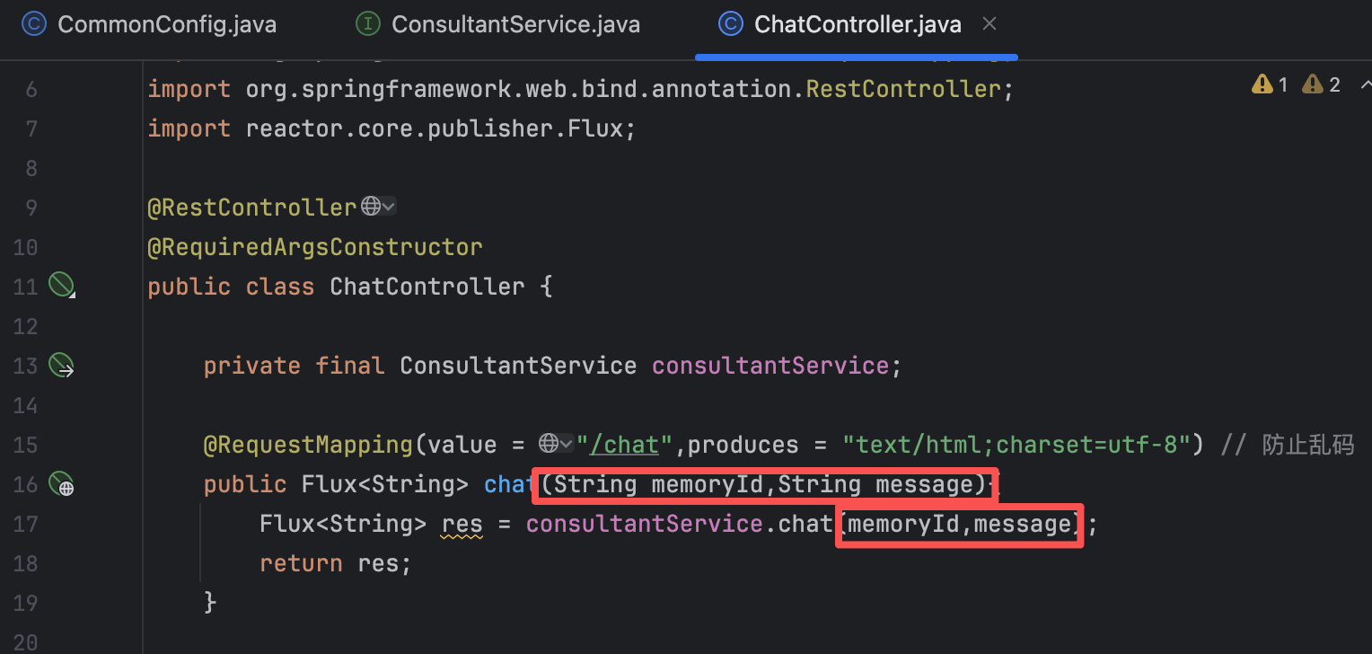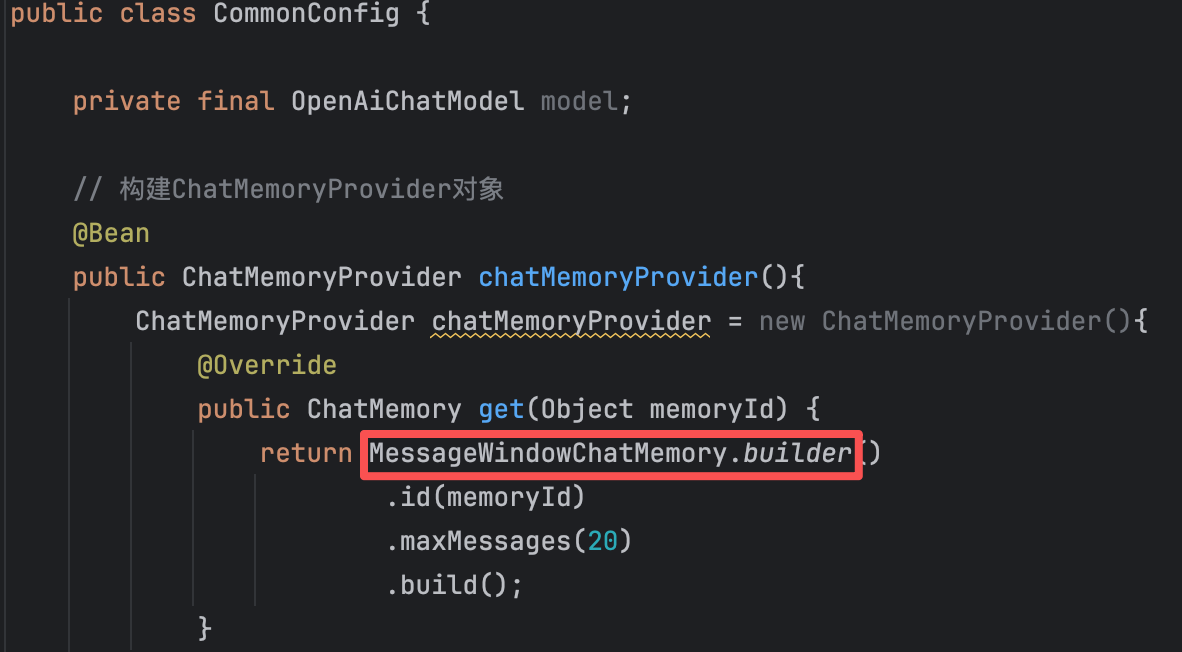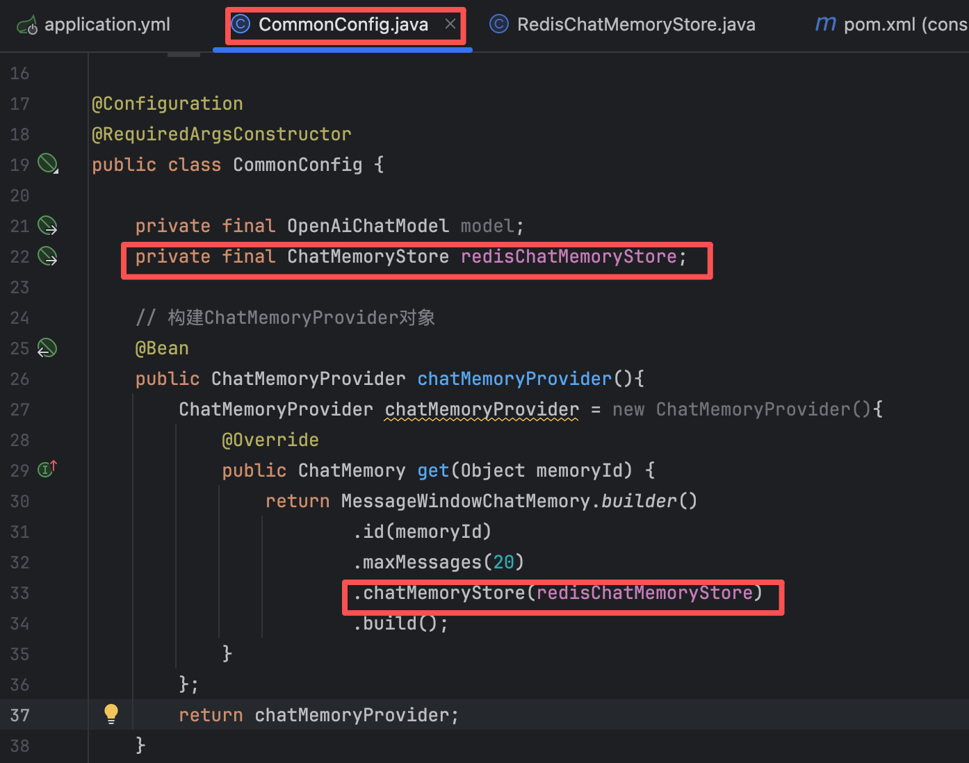 @Configuration @RequiredArgsConstructor public class CommonConfig { private final OpenAiChatModel model; private final ChatMemoryStore redisChatMemoryStore; private final EmbeddingModel embeddingModel; private final RedisEmbeddingStore redisEmbeddingStore; // 构建向量数据库,并将文档处理后存入向量数据库 @Bean public EmbeddingStore store(){ // embeddingstore的对象,这个对象的名字不能重复,所以这里使用store // 1.加载文档进内存 List<Document> documents = ClassPathDocumentLoader.loadDocuments("content",new ApachePdfBoxDocumentParser()); // 2.构建向量数据库(操作的是内存版本的向量数据库) // InMemoryEmbeddingStore store = new InMemoryEmbeddingStore(); // 构建文档分割器 DocumentSplitter ds = DocumentSplitters.recursive(500, 100); // 3.构建EmbeddingStoreIngestor对象,完成文本数据切割、向量化、存储 EmbeddingStoreIngestor ingestor = EmbeddingStoreIngestor.builder() .embeddingStore(redisEmbeddingStore) .documentSplitter(ds) .embeddingModel(embeddingModel) .build(); ingestor.ingest(documents); /* ingest()方法会将文档列表进行处理,主要包含以下几个步骤: 1. 文本拆分:将长文档分割成适当大小的文本块(chunks) 2. 向量化:通过嵌入模型(Embedding Model)将每个文本块转换为向量 3. 存储:将文本向量和对应的元数据存入向量数据库 */ return redisEmbeddingStore; } // 构建向量数据库检索对象 @Bean public ContentRetriever contentRetriever(/*EmbeddingStore store*/){ return EmbeddingStoreContentRetriever.builder() .embeddingStore(redisEmbeddingStore) .minScore(0.5) // 设置最小相似度分数阈值(0.0-1.0),只有相似度得分 >= 0.5的结果才会被返回,这个值控制检索精度,值越高结果越相关但可能数量越少 .maxResults(3) // 设置最大返回结果数量 .embeddingModel(embeddingModel) .build(); } }📍 小细节