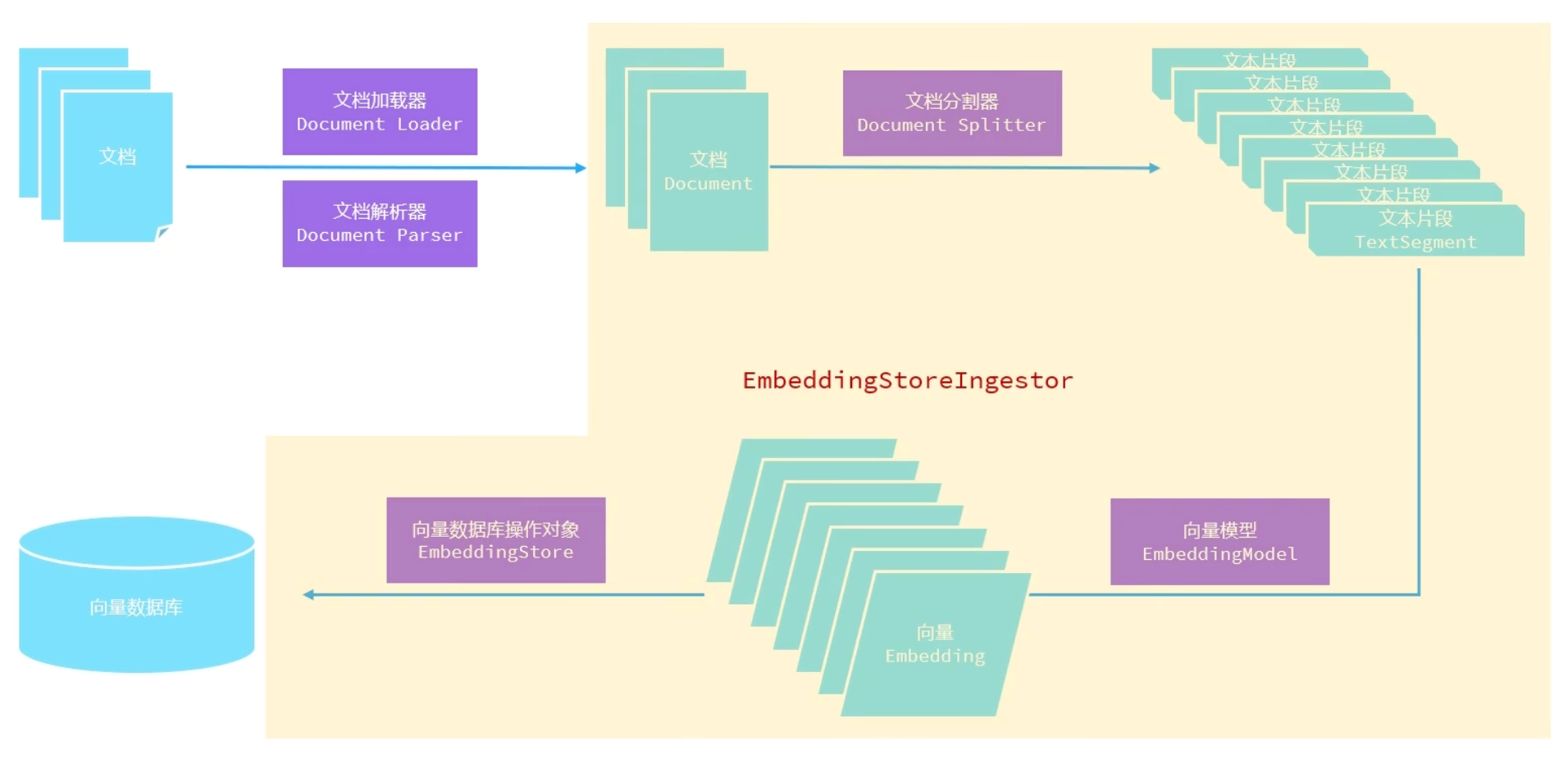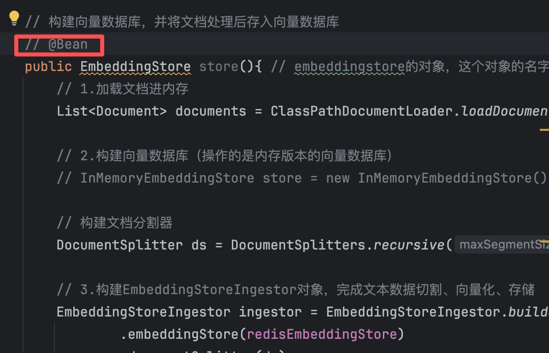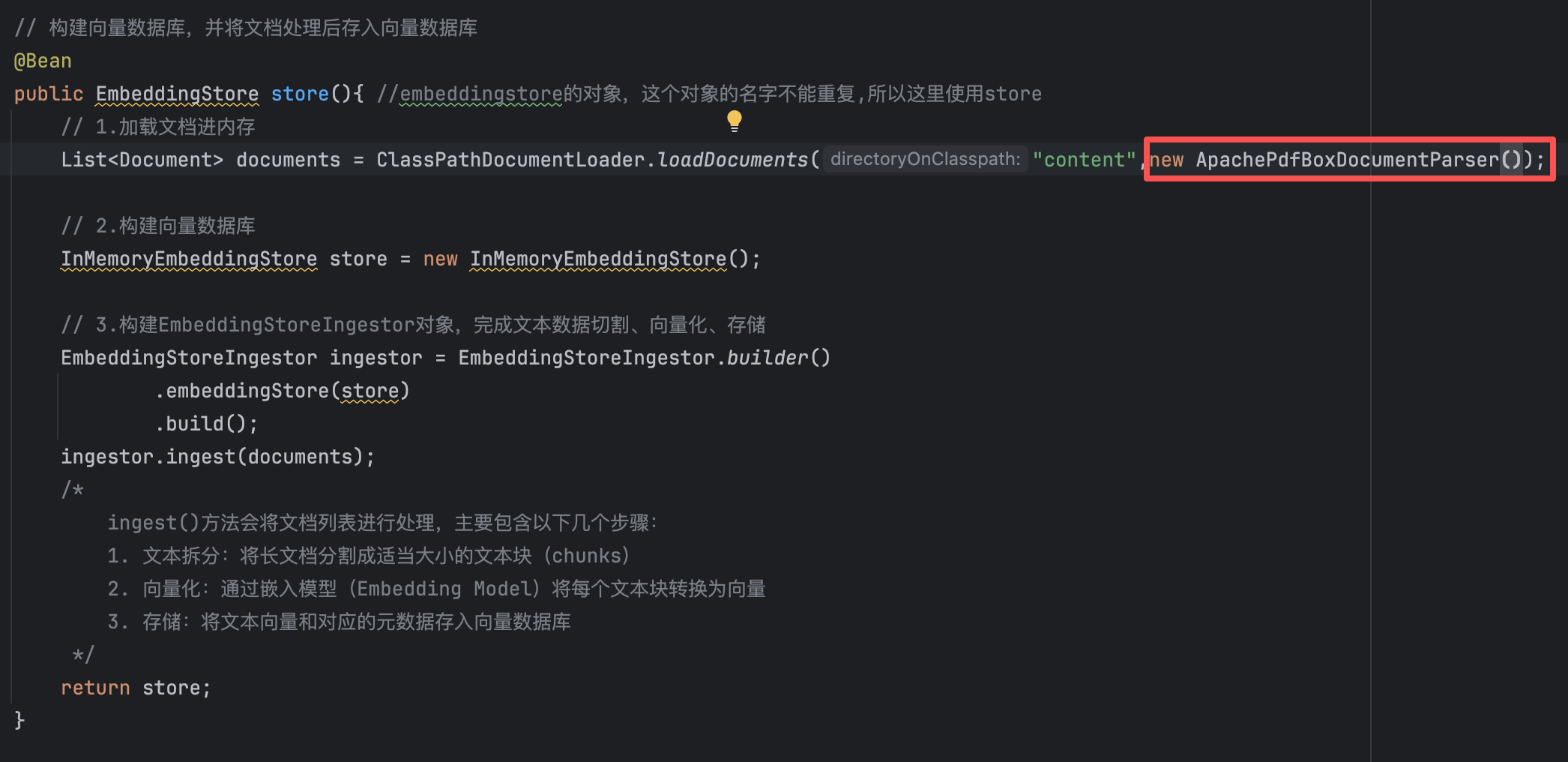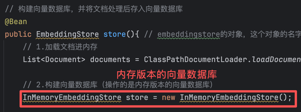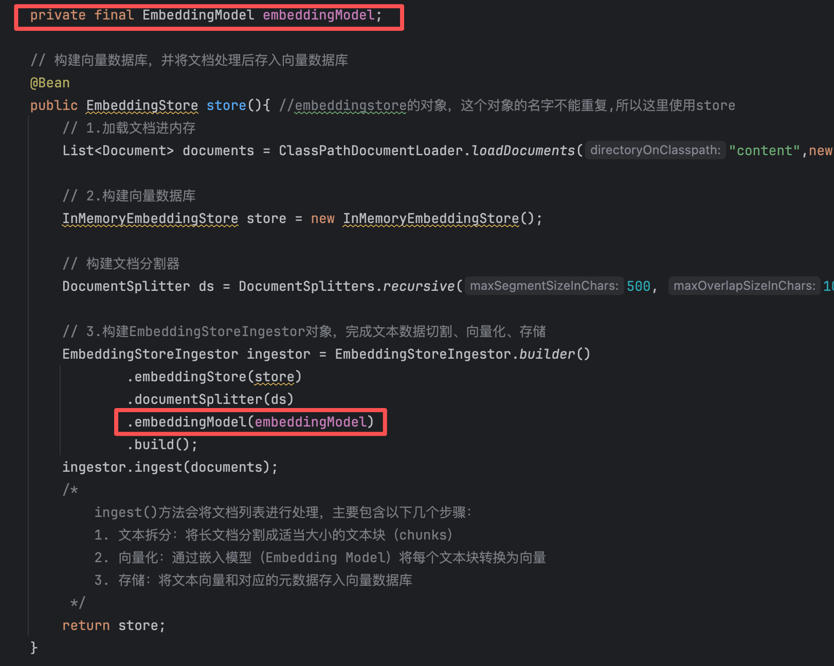 // 构建向量数据库,并将文档处理后存入向量数据库 @Bean public EmbeddingStore store(){ //embeddingstore的对象,这个对象的名字不能重复,所以这里使用store // 1.加载文档进内存 List<Document> documents = ClassPathDocumentLoader.loadDocuments("content",new ApachePdfBoxDocumentParser()); // 2.构建向量数据库 InMemoryEmbeddingStore store = new InMemoryEmbeddingStore(); // 构建文档分割器 DocumentSplitter ds = DocumentSplitters.recursive(500, 100); // 3.构建EmbeddingStoreIngestor对象,完成文本数据切割、向量化、存储 EmbeddingStoreIngestor ingestor = EmbeddingStoreIngestor.builder() .embeddingStore(store) .documentSplitter(ds) .build(); ingestor.ingest(documents); /* ingest()方法会将文档列表进行处理,主要包含以下几个步骤: 1. 文本拆分:将长文档分割成适当大小的文本块(chunks) 2. 向量化:通过嵌入模型(Embedding Model)将每个文本块转换为向量 3. 存储:将文本向量和对应的元数据存入向量数据库 */ return store; }