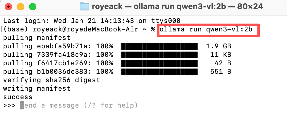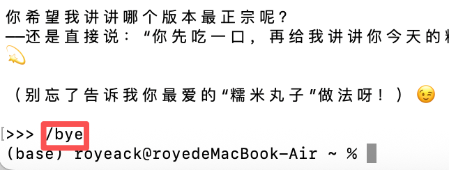 如果想要关闭对话,输入/bye即可,下次还想打开对话,输入ollama run qwen3-vl:2b即可回到对话。