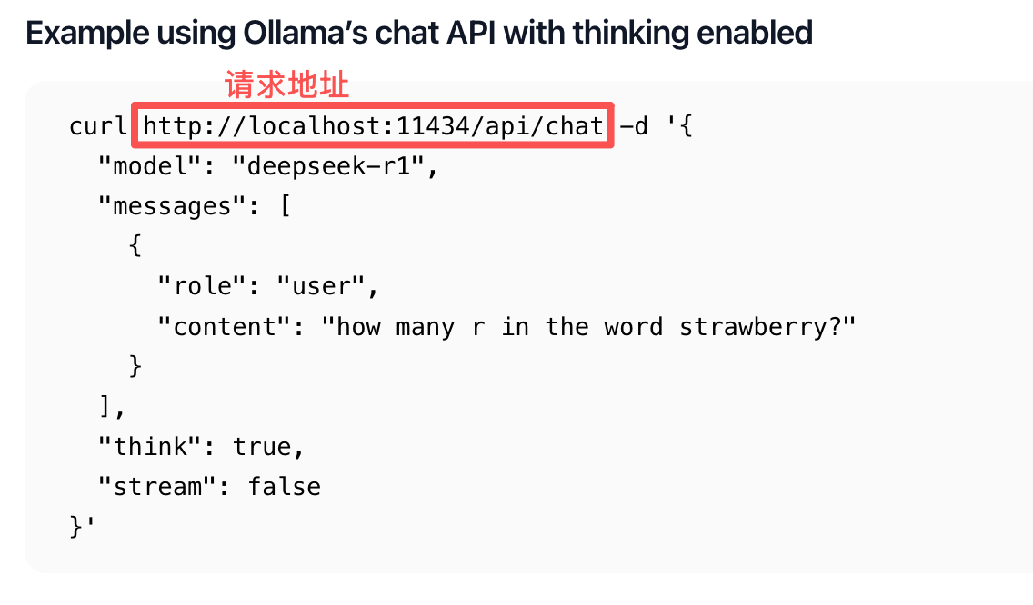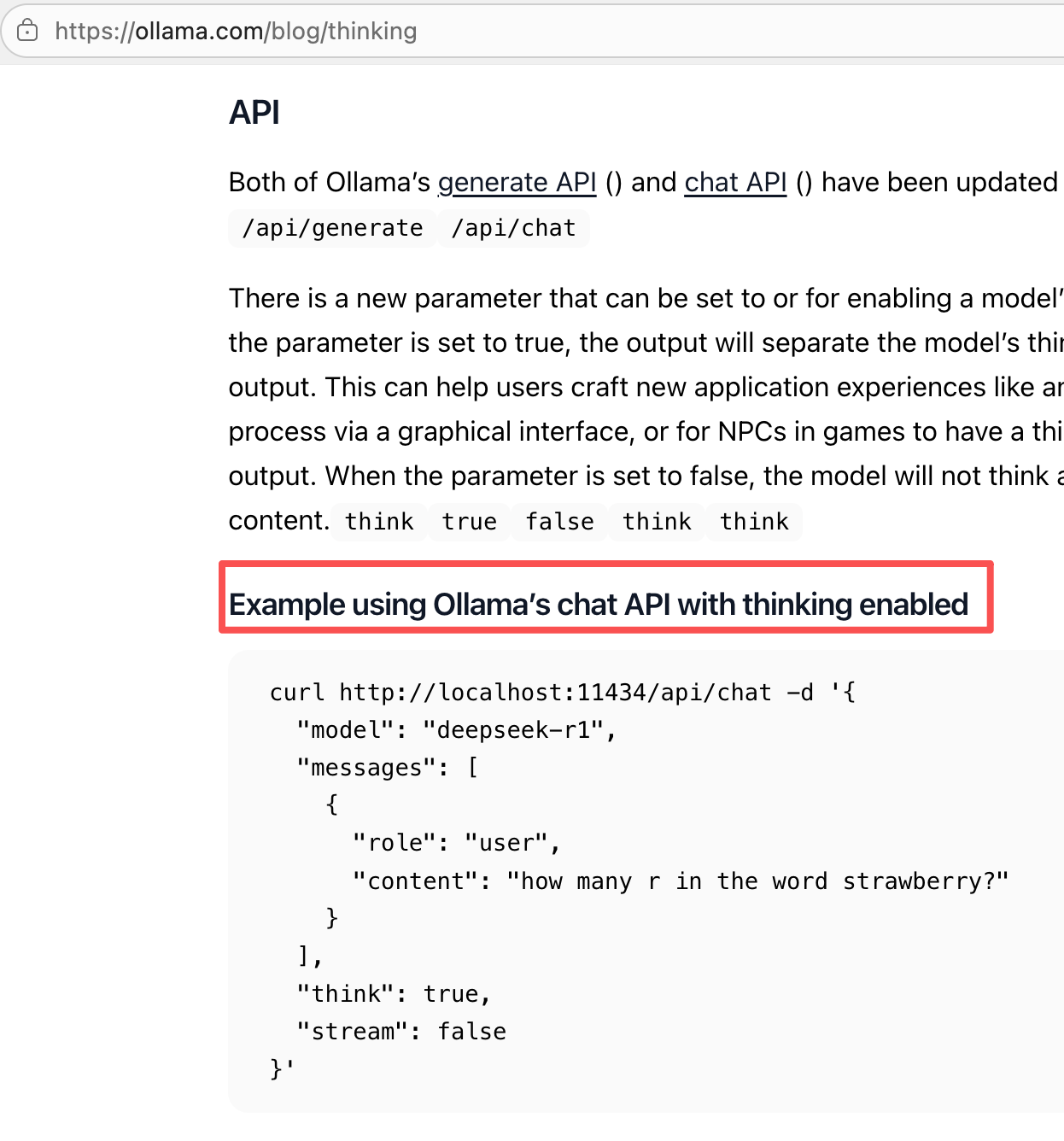 curl http://localhost:11434/api/chat -d '{ "model": "deepseek-r1", "messages": [ { "role": "user", "content": "how many r in the word strawberry?" } ], "think": true, "stream": false }'