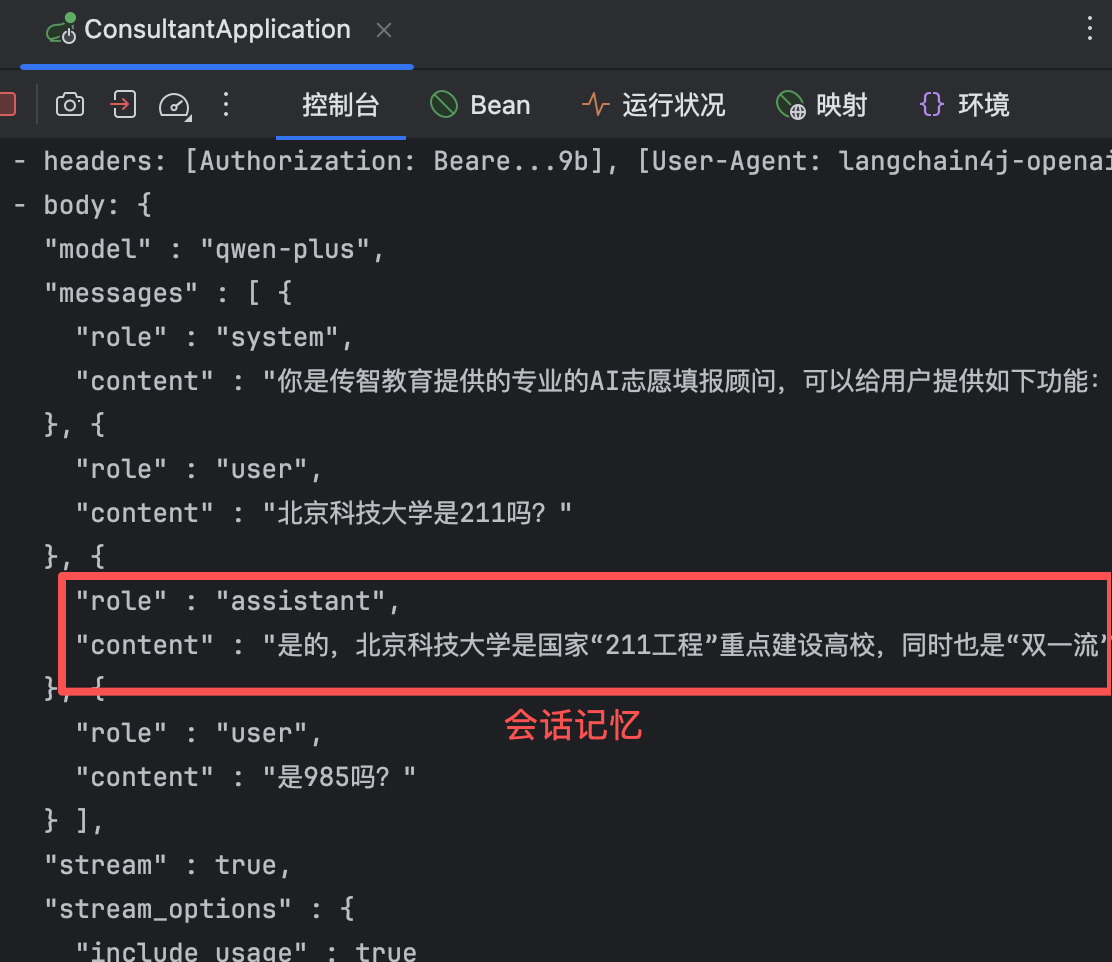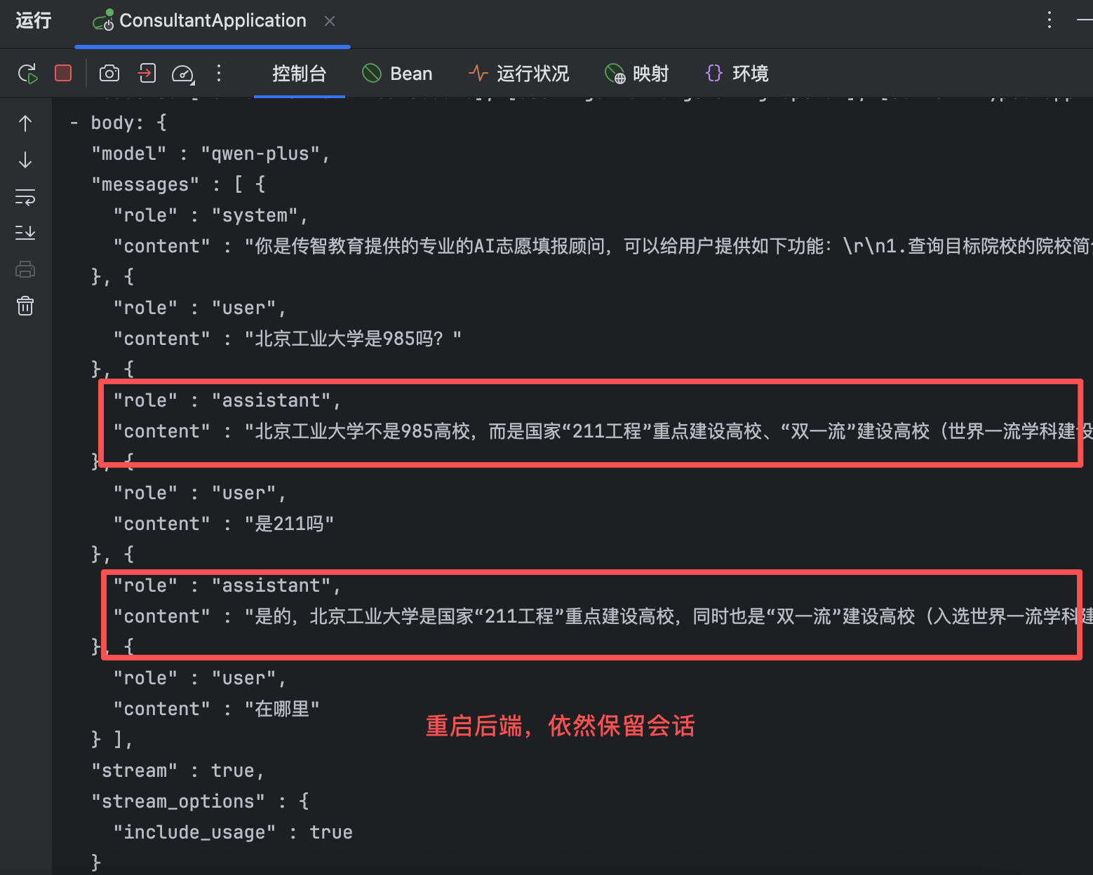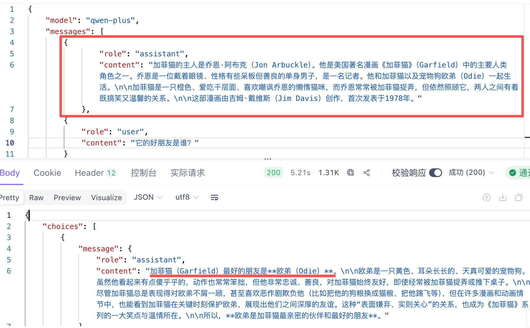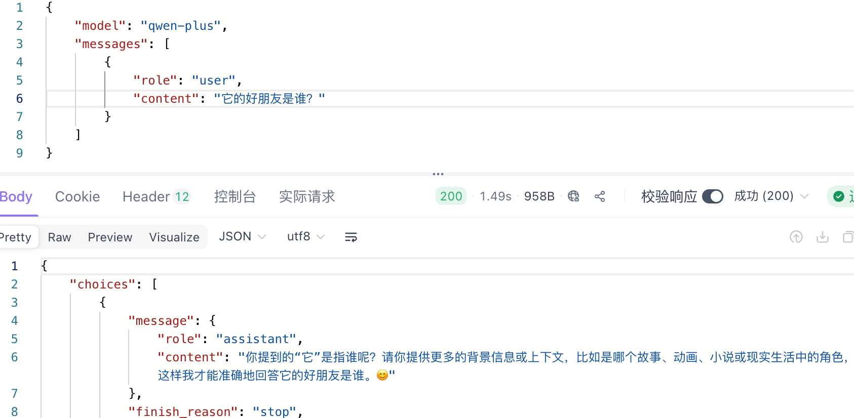 这就证明了调用Api接口时,大模型是没有联系上下文能力的。