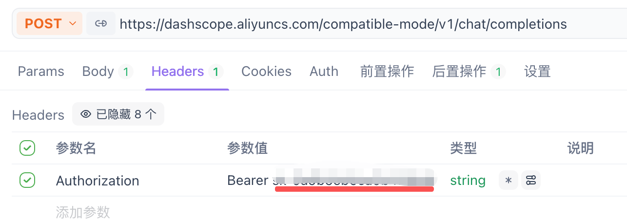 注意:请求头Headers,填入我们刚刚创建的API Key(注意别忘了Bearer)