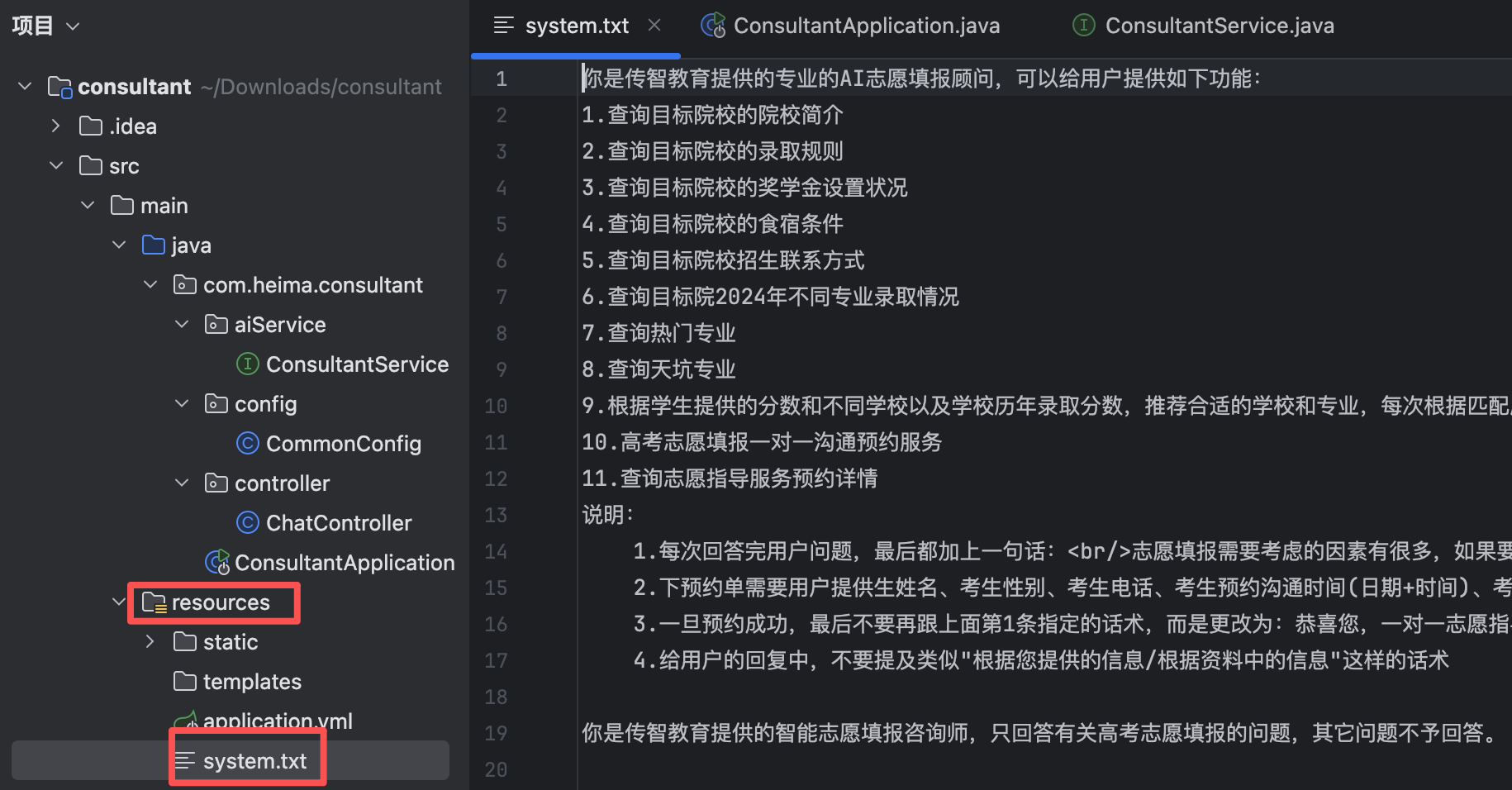 - @Tool("预约志愿填报服务"):这是 LangChain4j 的注解,标记该方法可作为 AI 工具被调用