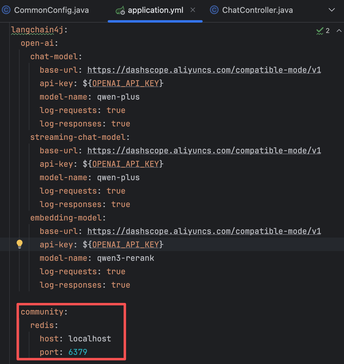 <!-- 引入langchain4j对于redis向量数据库的支持 --> <dependency> <groupId>dev.langchain4j</groupId> <artifactId>langchain4j-community-redis-spring-boot-starter</artifactId> <version>1.0.1-beta6</version> </dependency>③ 配置向量数据库信息