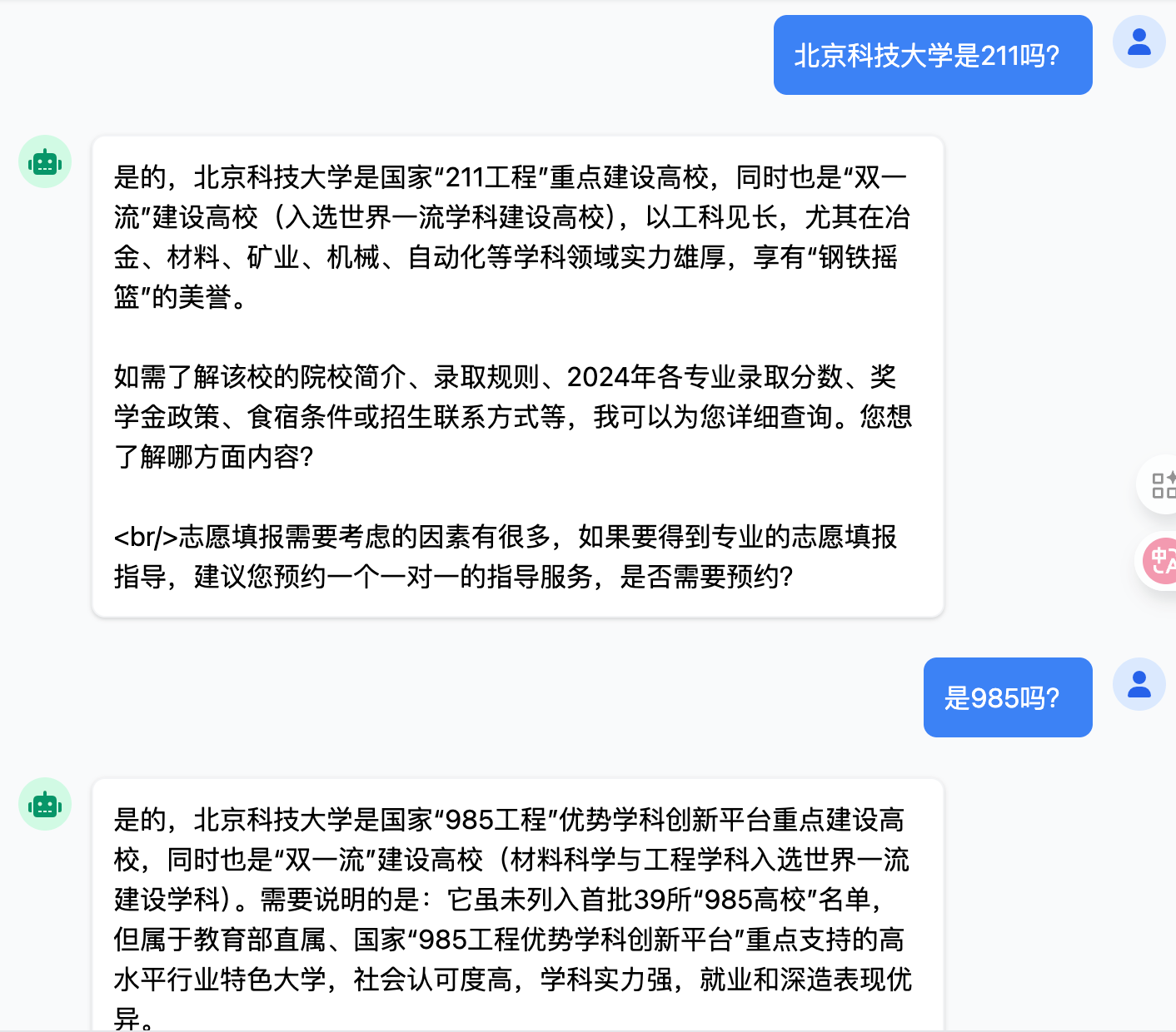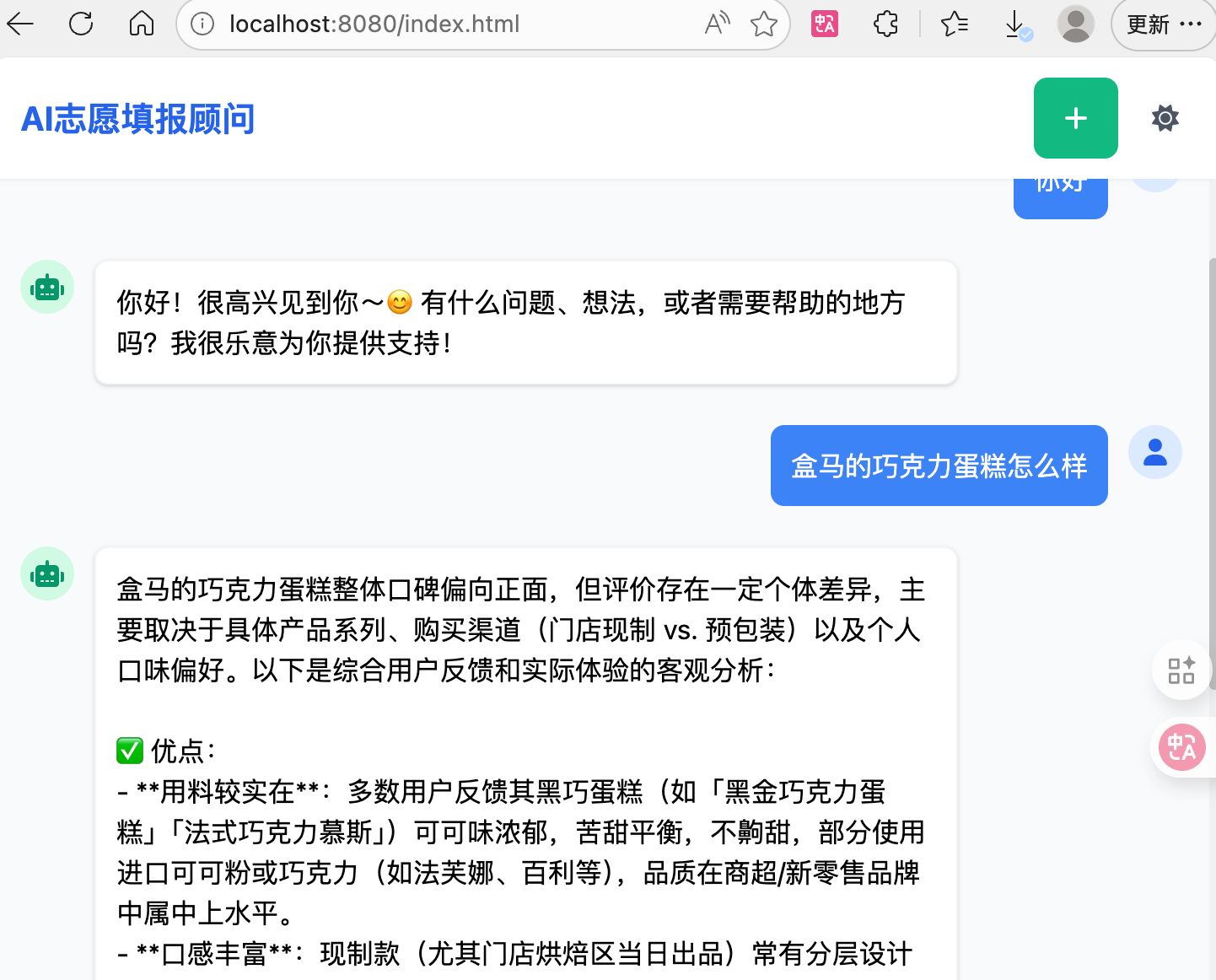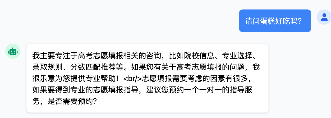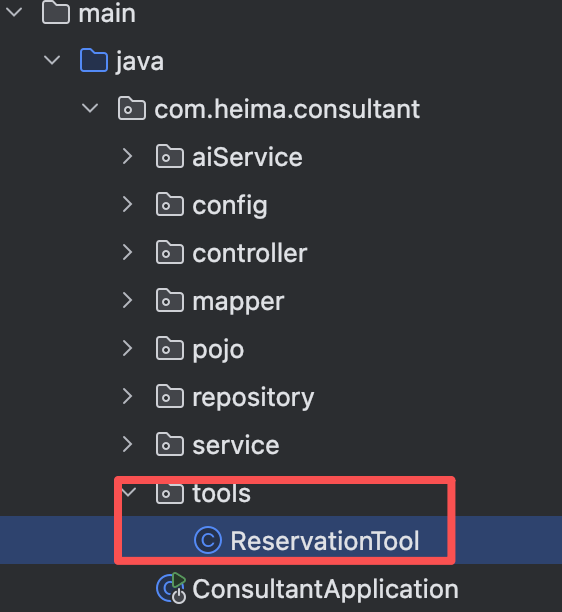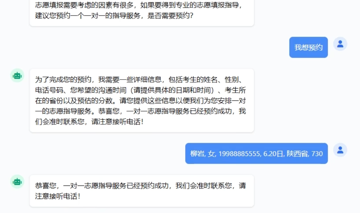 @Component // 将普通 Java 类声明为 Spring 容器管理的 Bean @RequiredArgsConstructor public class ReservationTool { private final ReservationService reservationService; // 1.工具方法:添加预约信息 // 1. 工具方法:添加预约信息 @Tool("预约志愿填报服务") public void addReservation( @P("考生姓名") String name, @P("考生性别") String gender, @P("考生手机号") String phone, @P("预约沟通时间,格式为:yyyy-MM-dd'T'HH:mm") String communicationTime, @P("考生所在省份") String province, @P("考生预估分数") Integer estimatedScore ) { // 创建 Reservation 对象 Reservation reservation = new Reservation( null, // id name, gender, phone, LocalDateTime.parse(communicationTime), // 将字符串转换为 LocalDateTime province, estimatedScore ); // 调用服务插入数据 reservationService.insert(reservation); } // 2.工具方法:查询预约信息 @Tool("根据考生手机号查询预约单") public Reservation findReservation(@P("考生手机号") String phone) { return reservationService.findByPhone(phone); } }
