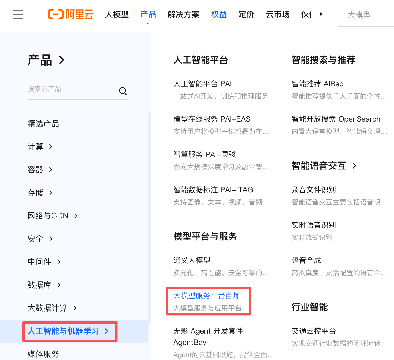 首先登录阿里云,在主页的【产品】→【人工智能与机器学习】→【大模型服务平台百炼】