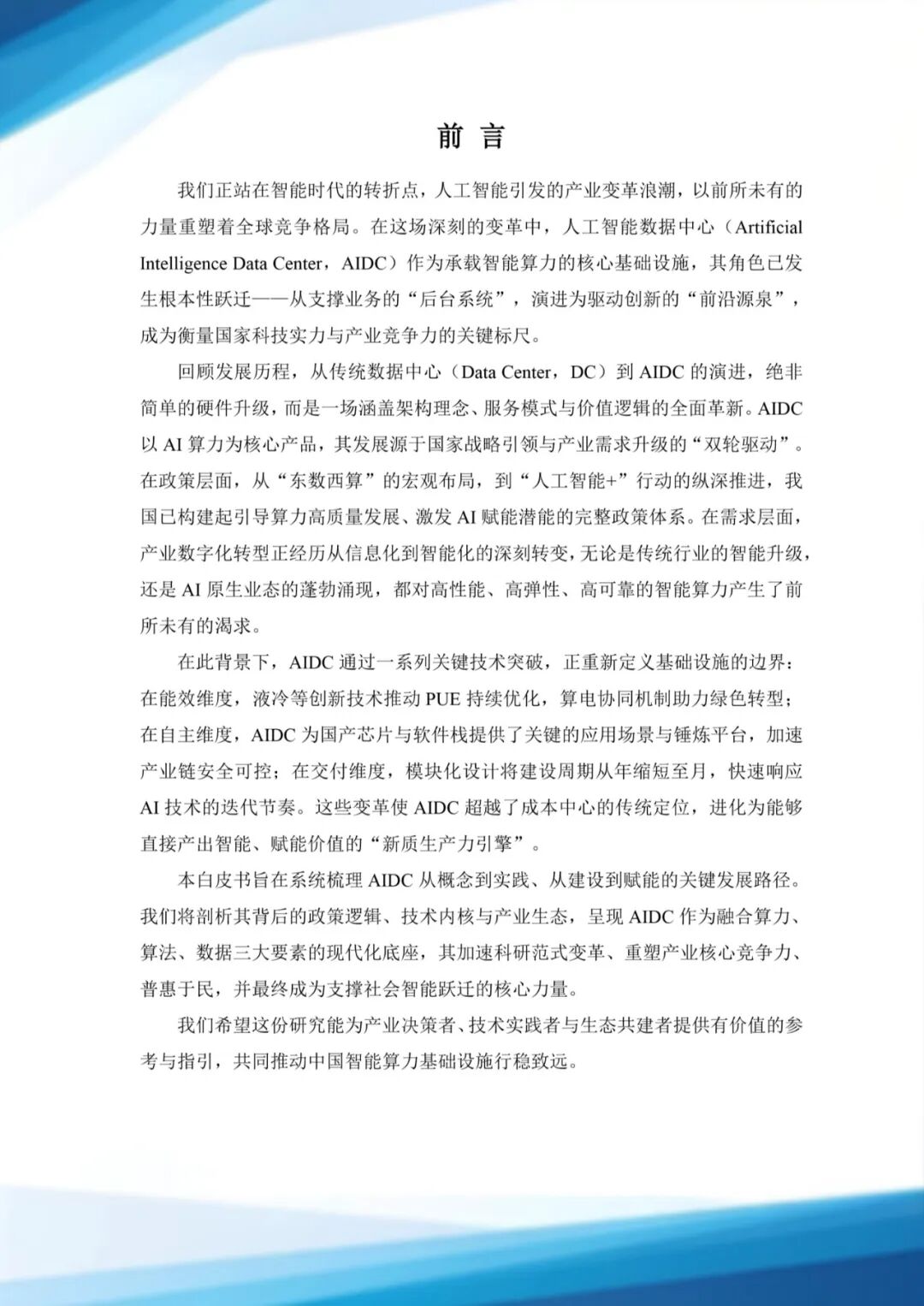 白皮书旨在系统梳理AIDC从概念到实践、从建设到赋能的关键发展路径。将剖析其背后的政策逻辑、技术内核与产业生态,呈现AIDC作为融合算力、算法、数据三大要素的现代化底座,其加速科研范式变革、重塑产业核心竞争力、普惠于民,并最终成为支撑社会智能跃迁的核心力量。