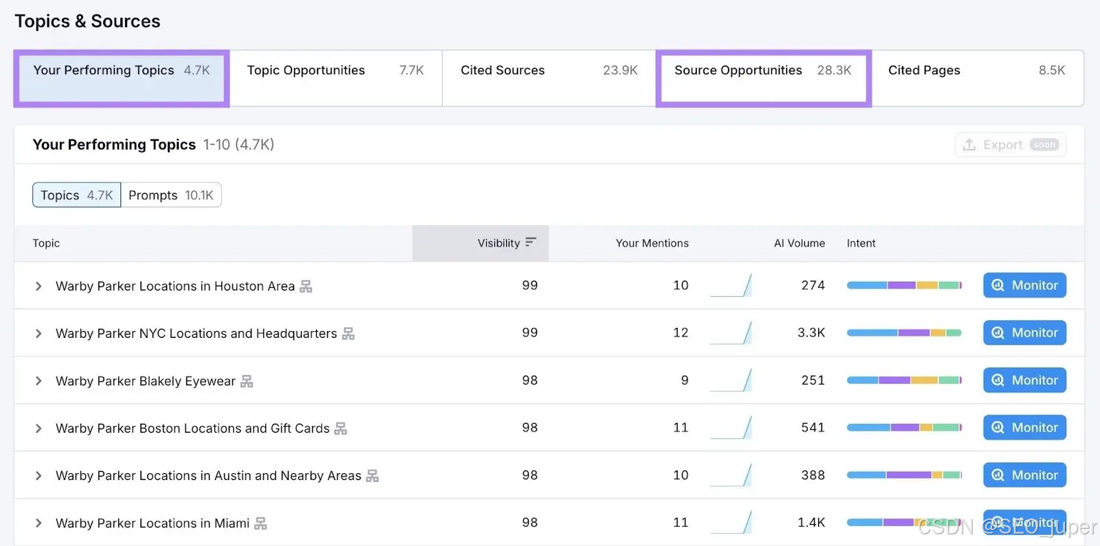 Semrush AI Visibility Toolkit是核心工具:输入域名后,可查看品牌在ChatGPT、Google AI Mode等平台的总提及量、被引用页面数,以及“高潜力话题”(即AI频繁回答但未引用你的领域)。例如,若工具显示“Warby Parker纽约门店”相关查询的AI提及量高但你的品牌未被引用,即可针对性优化该主题内容。