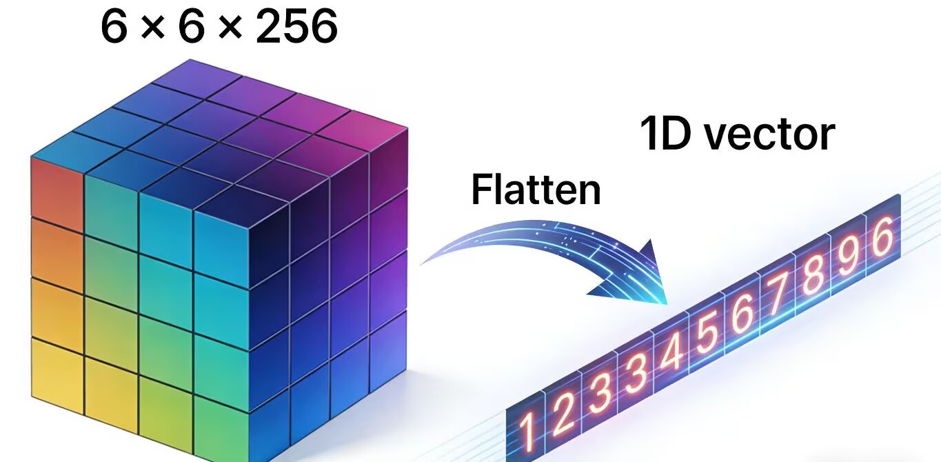 卷积层输出的是多维特征图,但全连接层(FC)只能处理一维向量。平铺层的任务就是:把 6×6×256 这样的多维数据,按顺序展开成 6×6×256 = 9216 维的一维向量,让全连接层能接收并处理。如下图所示