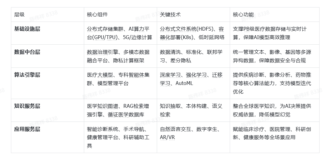 超级AI医院采用五层技术架构,从基础设施到应用层形成闭环,保障系统高效、安全、可扩展运行: