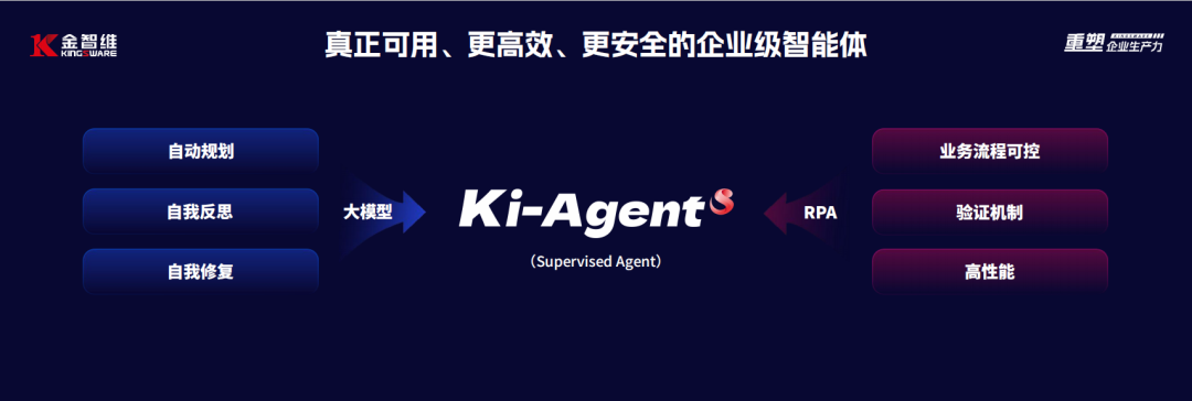 •金智维:是金融、政务等重资产、高合规要求行业的典型代表。这类行业对系统的安全性、合规性与执行准确性有着近乎苛刻的要求,传统对话式AI常因“幻觉”等问题难以应用于关键业务。为此,金智维提出了“受监督智能体”这一技术路径,其核心在于将大模型的认知与规划能力,与稳定可靠的RPA执行引擎深度融合。基于Ki-AgentS与K-APA平台,金智维构建了“大脑规划、四肢执行”的协同体系:大模型负责意图识别与任务分解,RPA则承担具体、可验证的自动化操作。