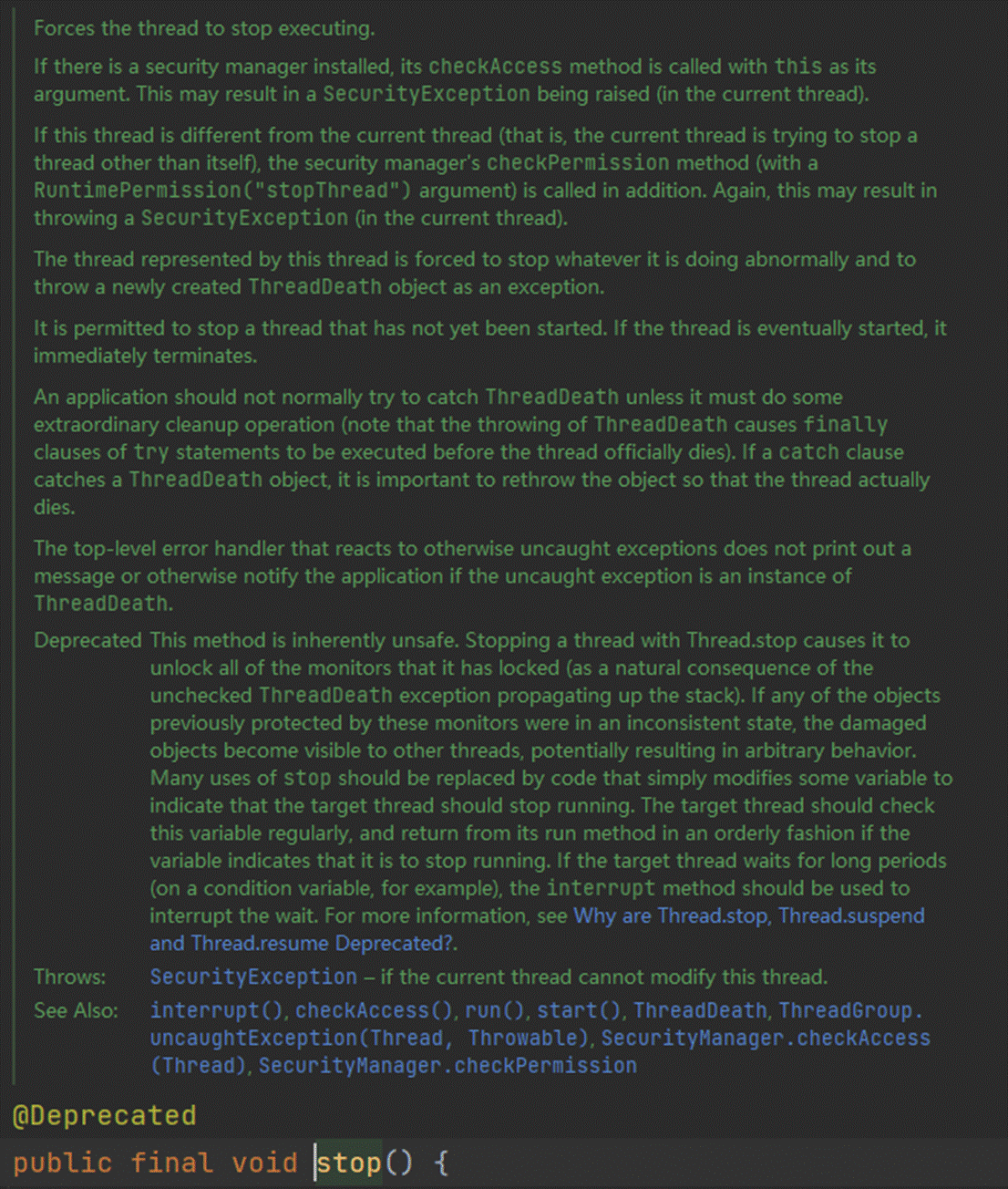 stop 方法是被 @Deprecated 修饰的不建议使用的过期方法,并且在注释的第一句话就说明了 stop 方法为非安全的方法。