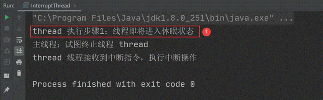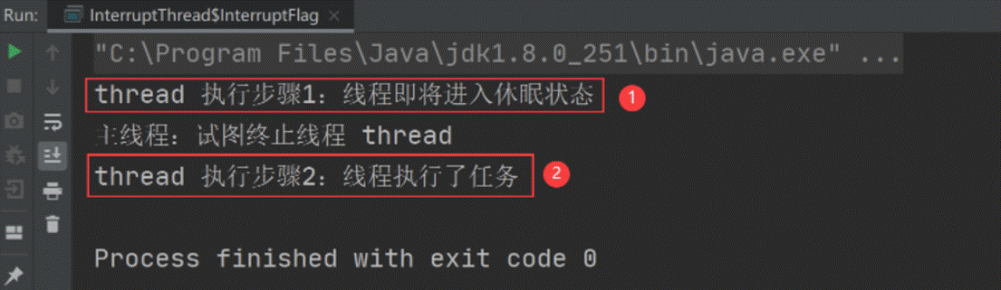 输出:我们期望的是:线程执行了步骤 1 之后,收到中断线程的指令,然后就不要再执行步骤 2 了,但从上述执行结果可以看出,使用自定义中断标识符是没办法实现我们预期的结果的,这就是自定义中断标识符,响应不够及时的问题。