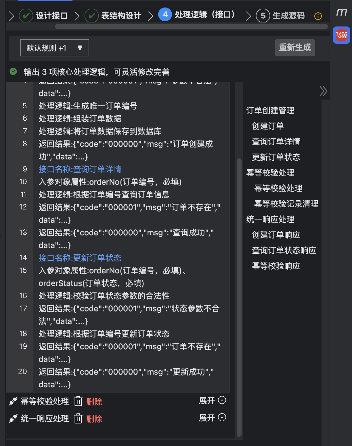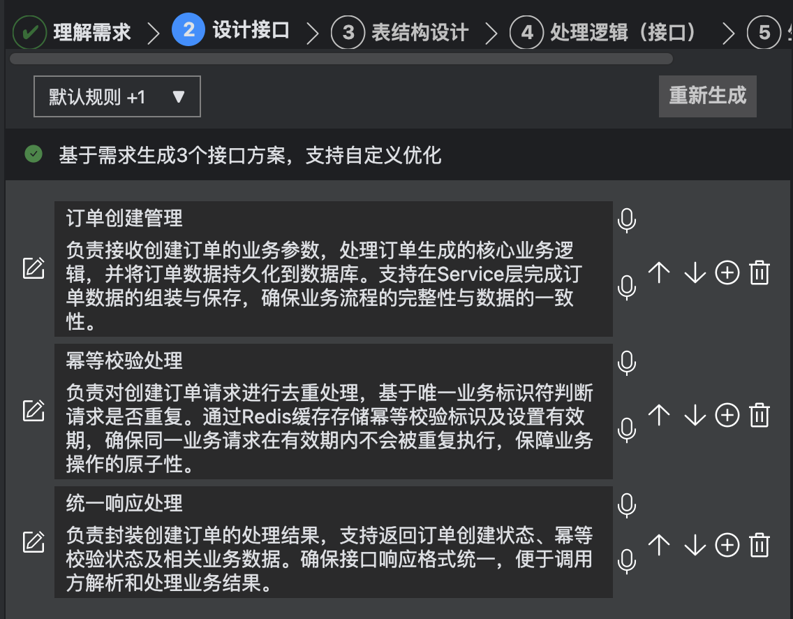 “处理逻辑(接口)” 功能,核心是把前面的需求、接口和表结构设计,转化为每个接口的详细执行步骤、入参出参定义和分支场景逻辑,相当于给开发人员提供了一份 “业务逻辑说明书”,让抽象的设计直接变成可落地的开发指南。