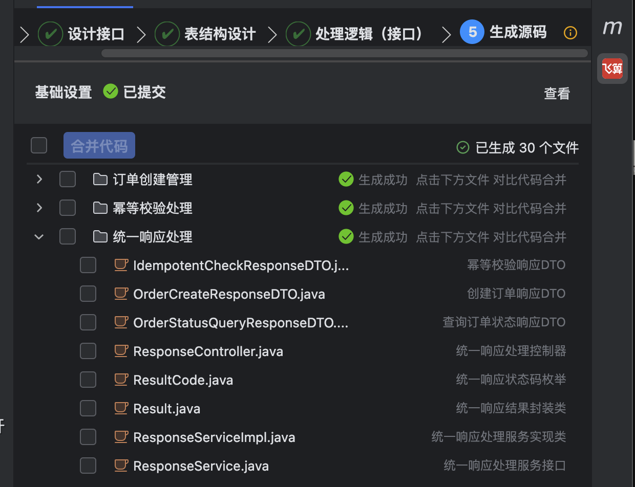“生成源码” 功能,是整个开发流程的最终落地环节,它会把我前面所有的需求拆解、接口设计、表结构和处理逻辑,一键转化为完整、可运行的 Java 项目源码,相当于一个 “自动化的代码生成器 + 项目脚手架”。