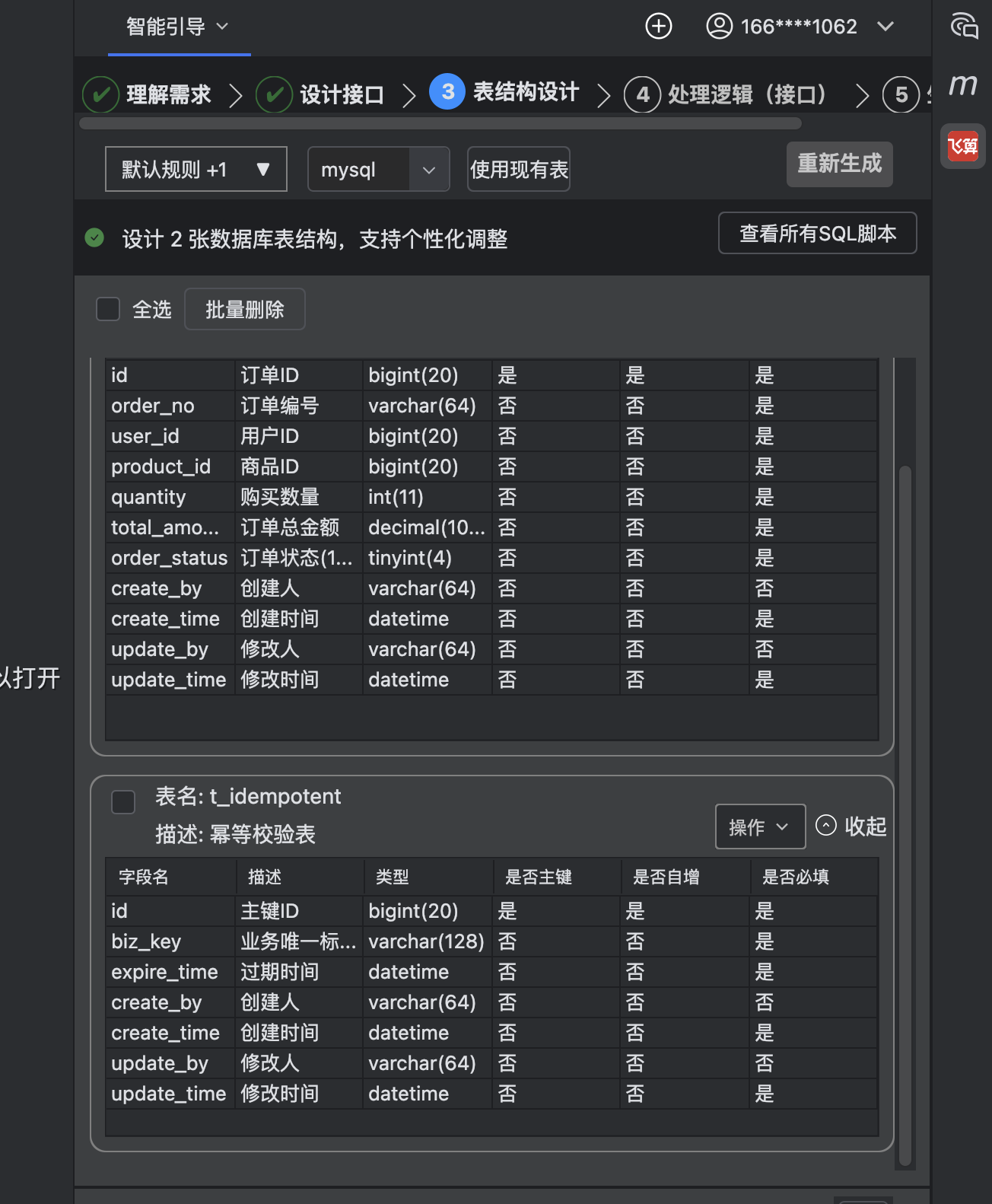 表结构设计功能的核心是基于我前面的业务需求和接口设计,自动生成配套的数据库表结构,让数据存储和业务逻辑完全对应起来,同时支持个性化调整。