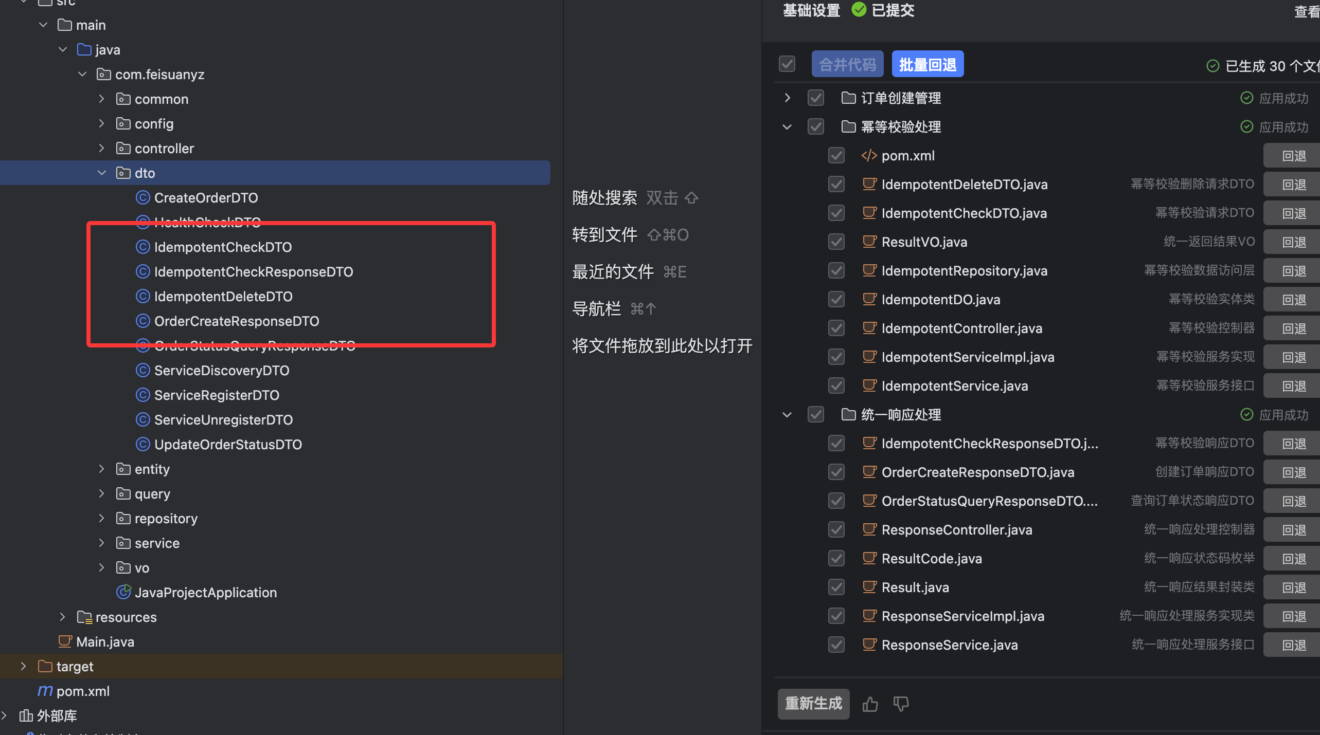 我尝试让飞算JavaAI专业版生成整个“订单服务”骨架。输入需求:“基于Spring Boot 3 + MyBatis-Plus,实现带幂等校验的创建订单接口,包含DTO、Service、Controller三层,使用Redis防重。”