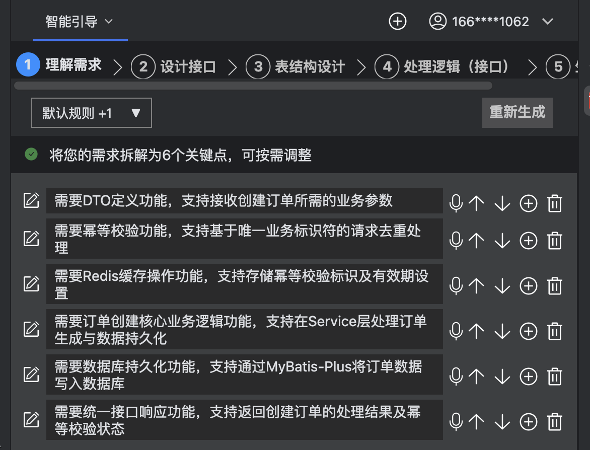 智能引导一共分为五个环节,第一个环节是理解需求,核心是把我的业务需求自动拆解成一套标准化、可落地的技术实现模块,帮我梳理出开发一个完整接口需要的所有关键环节。
