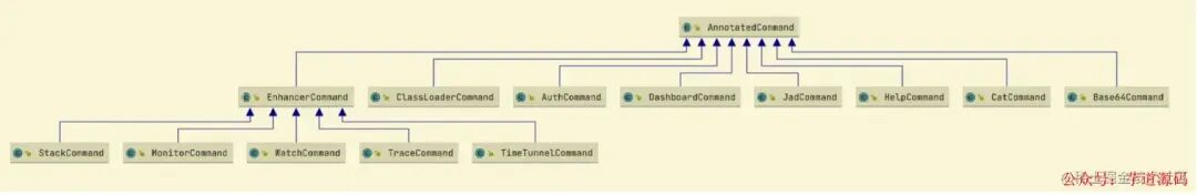 Arthas命令很多,如果是exit、logout、quit、jobs、fg、bg、kill等简单的命令,就会直接执行,如果是trace这种复杂的命令,会专门用一个类写处理的逻辑,如上图,根据名字就可以猜到这个类是处理什么命令的,这么多类的组织形式是模版模式,入口在com.taobao.arthas.core.shell.command.AnnotatedCommand#process,
