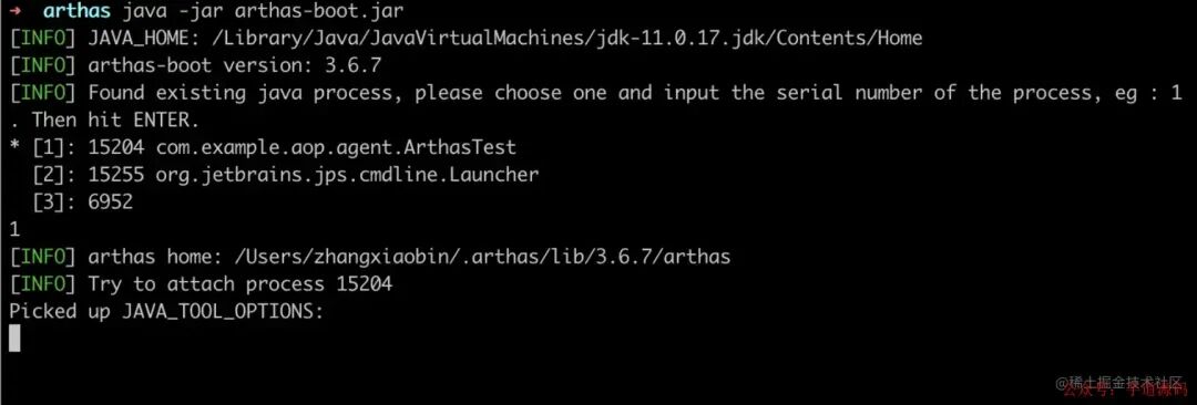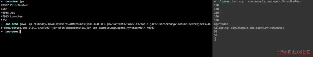 java -javaagent:/Users/zhangxiaobin/IdeaProjects/aop-demo/target/aop-0.0.1-SNAPSHOT-jar-with-dependencies.jar com.example.aop.agent.MyTestpublic class MyTest { public static void main(String[] args) throws InterruptedException { Thread.sleep(3000); }}