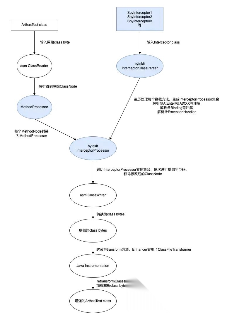 在看trace命令之前需要一点前置知识,使用ASM进行字节码增强,代码逻辑不好修改,理解困难,所以bytekit基于ASM提供了一套简洁的API,让开发人员可以比较轻松地完成字节码增强,我们先来看一个简单的demo,来自https://github.com/alibaba/bytekit