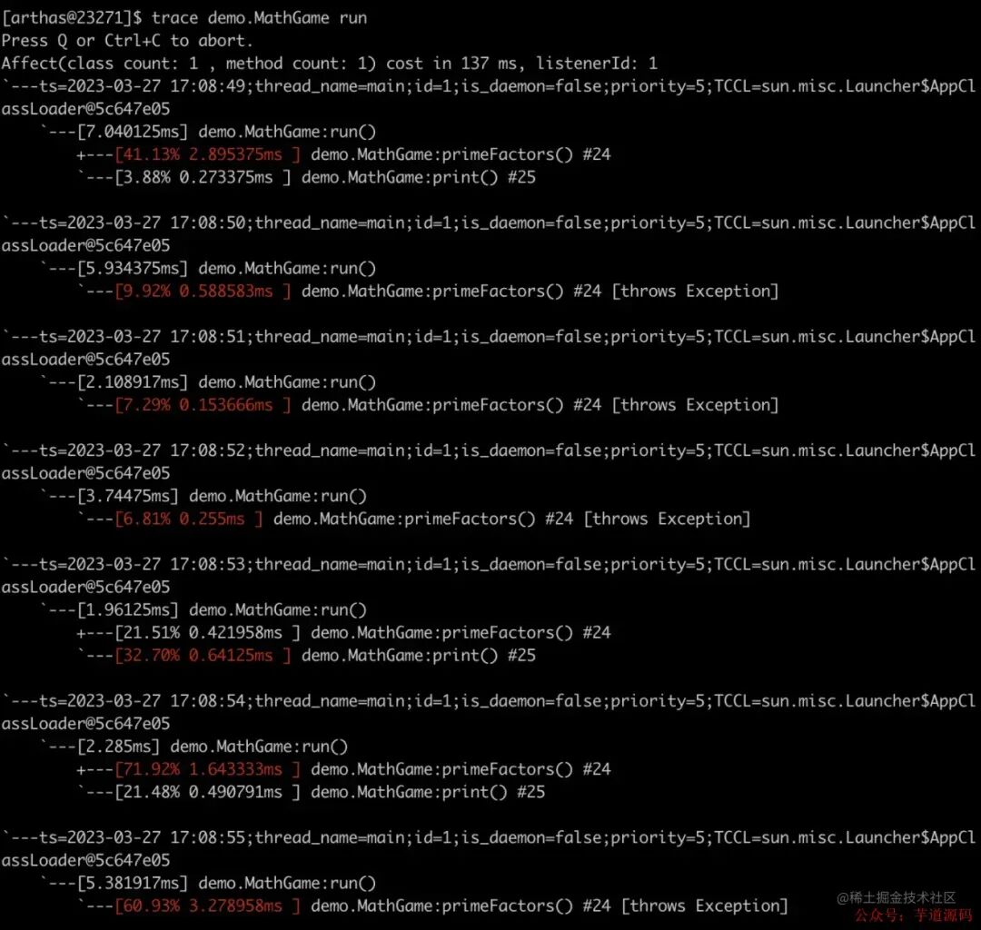 以上是我写的小demo,有很多不足之处,看看大佬是怎么写的,arthas的trace命令可以统计方法耗时,如下图